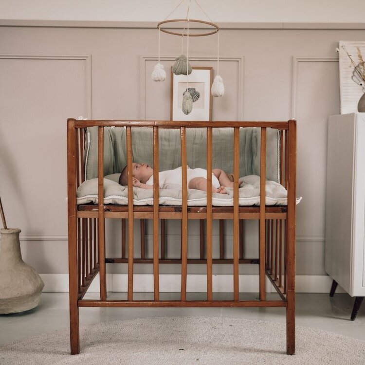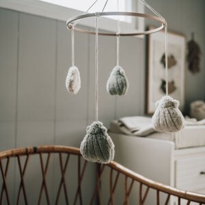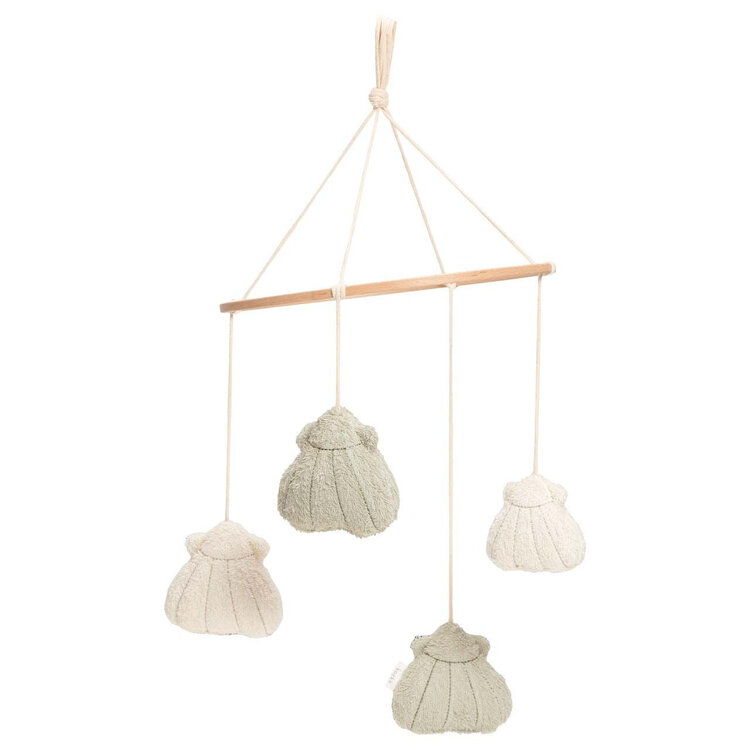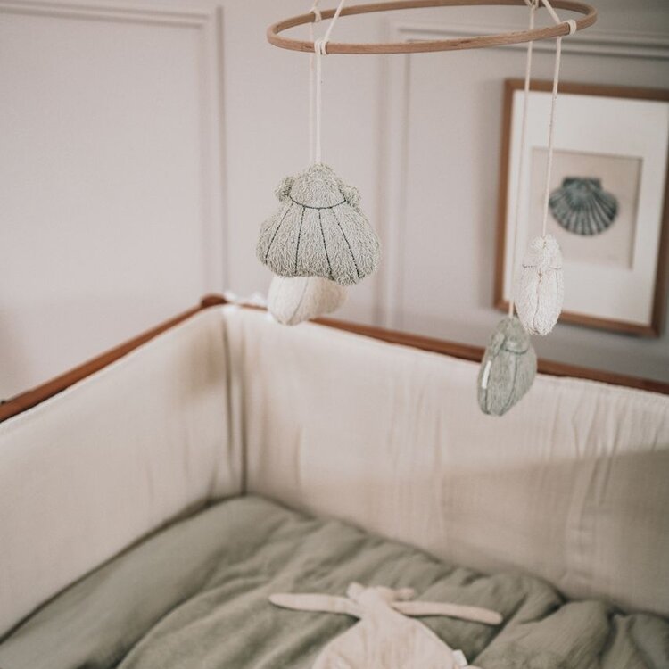 Hoor je het ruisen van de zee in de zachte schelpen in warme kleuren? Hang de mobiel boven het bedje of boven de box en je baby droomt heerlijk weg.