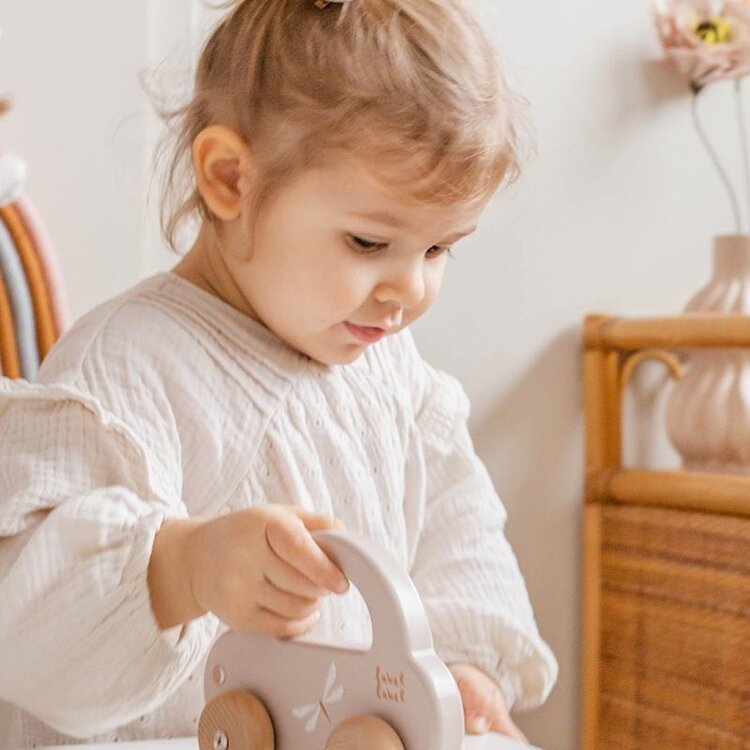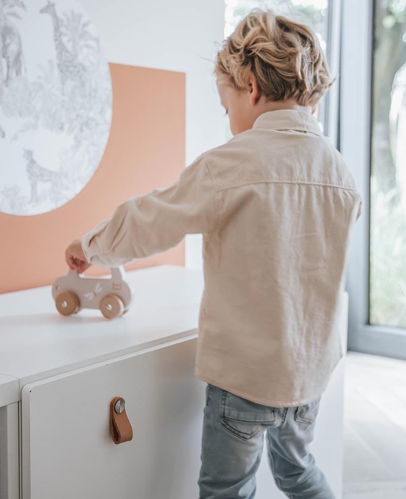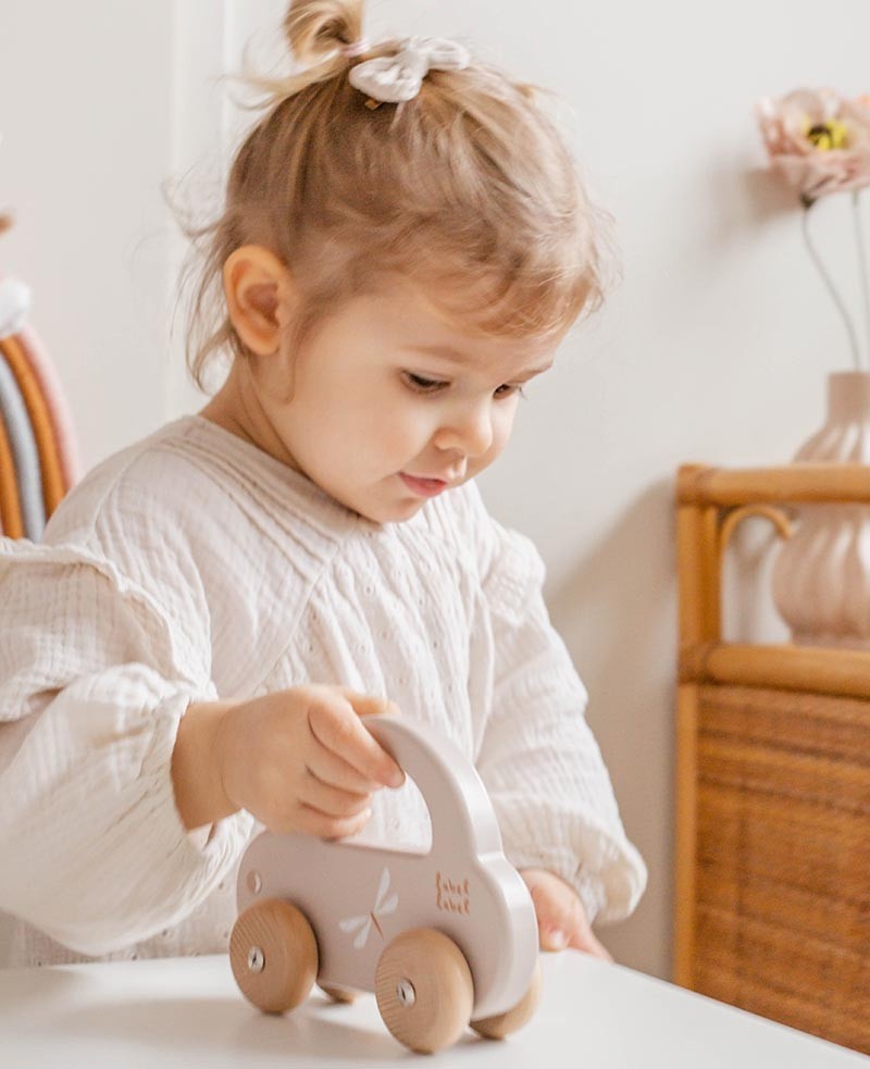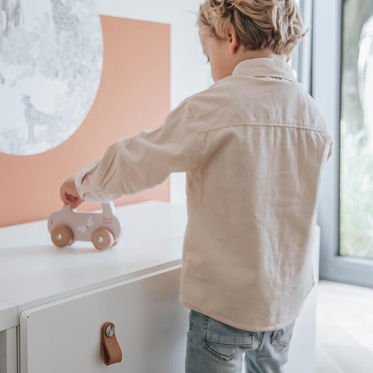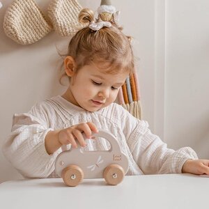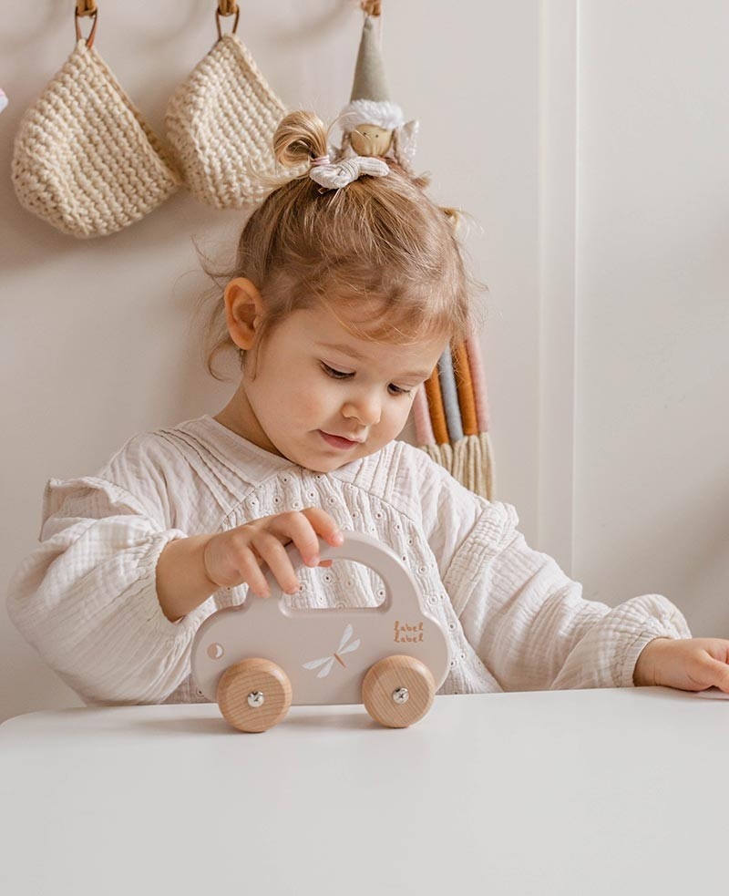 Peuters nemen de auto makkelijk vast aan het handvat om de auto te laten rijden of hem mee te nemen naar waar die maar wil. Het gestroomlijnde design van de auto, de zachte kleuren in combinatie met natuurlijk houten wielen zijn perfect om je peuter zijn motorische ontwikkeling te stimuleren.