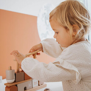 Met deze stapelblokjes in verschillende vormen, kleuren en niveaus bouwt je peuter zijn eigen droomhuisje.