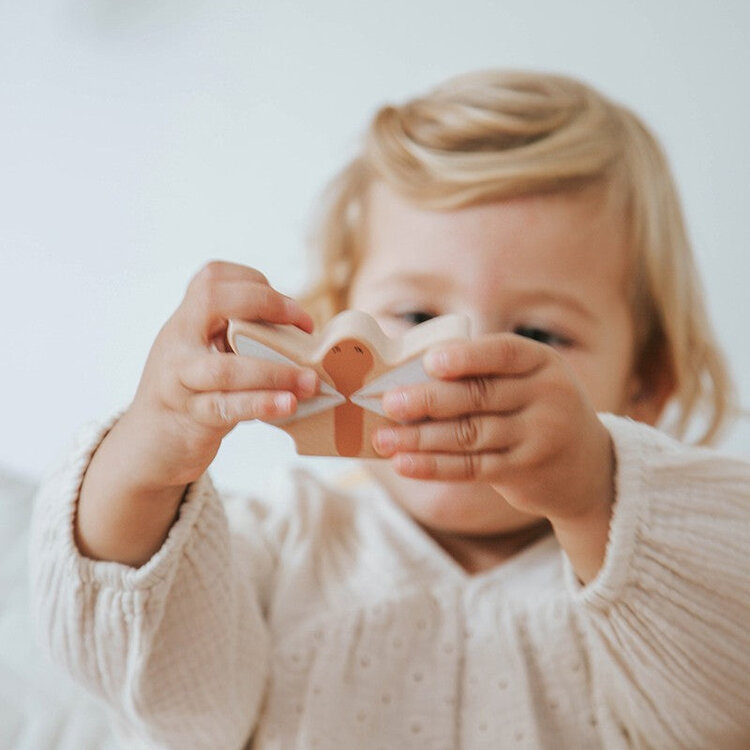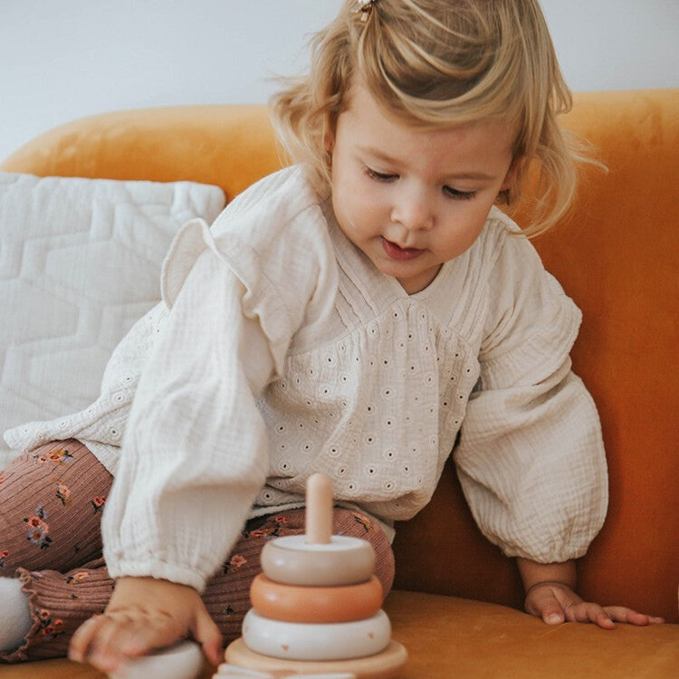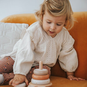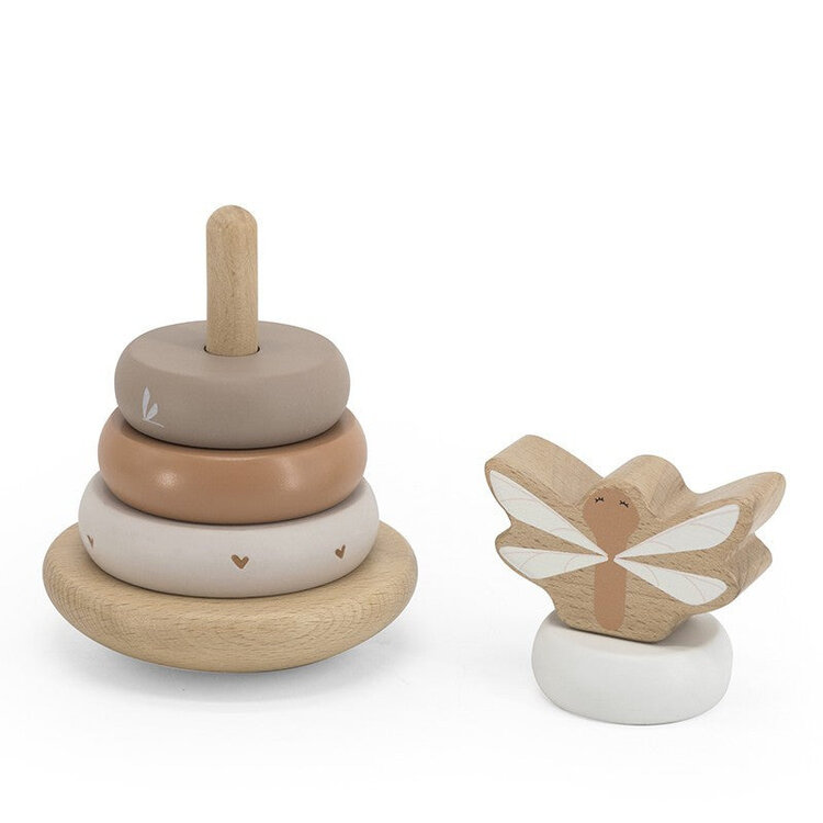 De houten ringen en topblok zijn makkelijk vast te nemen voor de kleine handjes. Stapelen van groot naar klein of van klein naar groot of sorteer de kleuren... uw kindje kan zelf beslissen wat die leuk vindt en ondertussen oefent hij/zij de hand-oog coördinatie en redeneringsvorm.