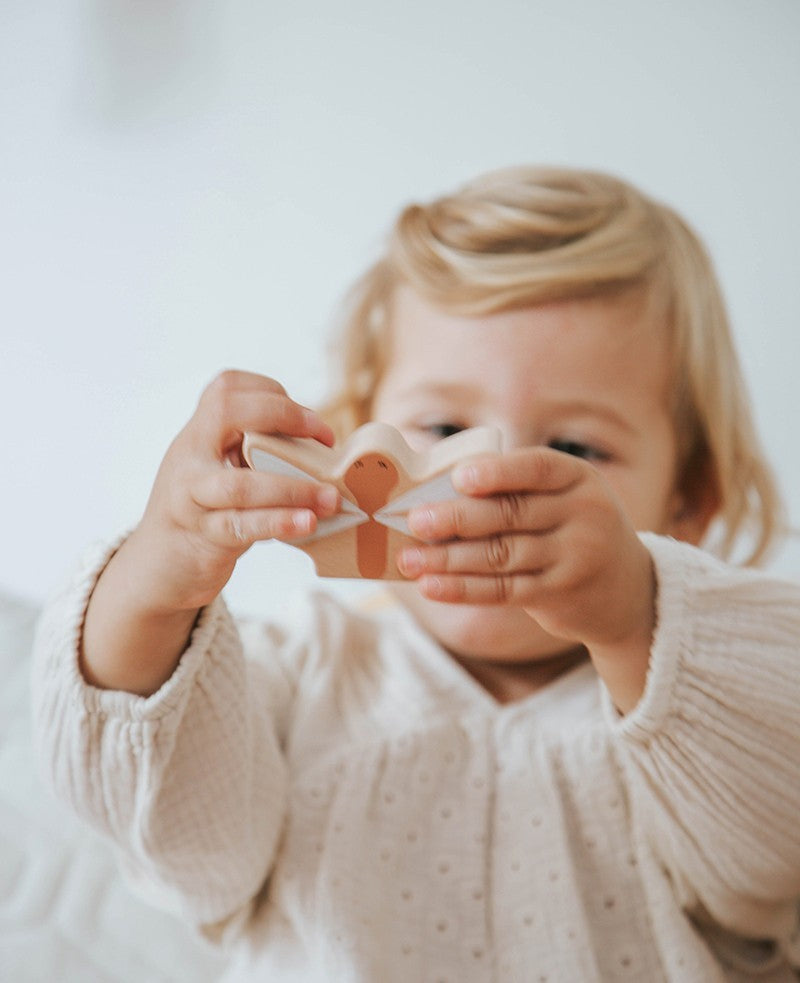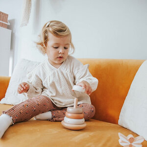 De pyramide op schommelbasis is vervaardigd uit kwaliteitsvol FSC gecertificeerd beukenhout en werd voorzien van prachtige nougat tinten met behulp van kindvriendelijke verf op waterbasis. De roze stapelringen en topblok kregen een leuk symbool.
