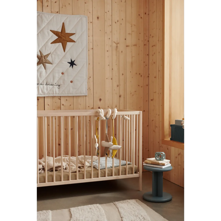 Ga creatief aan de slag en stel je eigen mobiel voor je baby samen met de Walther mobiel. Deze mobiel is gemaakt van een mix van 100% biologisch katoen en linnen en heeft een band en lus aan de onderkant waaraan je meer speelgoed kunt hangen. Er hangen verschillende zachte dieren aan om mee te spelen en ter decoratie, en het kan worden gecombineerd met de Benedict of Edmund multiringen. Een must-have om boven de wieg, het ledikantje of de commode te hangen, en geschikt voor alle leeftijden.