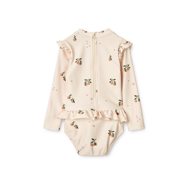 De bedrukte Sille Swim Jumpsuit is gemaakt van gerecycled polyester, heeft lange mouwen, ruches op schouders en taille en is zowel decoratief als perfect om veilig in de zon te spelen. Het baby model heeft handige drukknoopjes voor het verschonen.