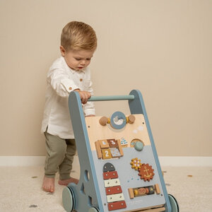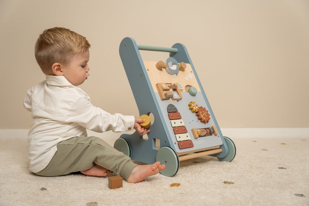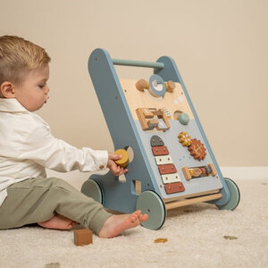 Deze houten activiteiten loopwagen biedt verschillende uitdagende activiteiten die de ontwikkeling van jouw kindjes motoriek ondersteunen. Er zijn 8 activiteiten om te verkennen en onder de knie te krijgen. Dankzij het uitgebalanceerde ontwerp is de loopwagen een fijne hulp voor kinderen van 12 maanden of ouder die bijna klaar zijn om hun eerste stapjes te zetten. Bereid je voor op vrolijk gejuich als je kleintje door het huis snelt. De rubberen wielen zorgen ervoor dat je geen krassen op je vloer krijgt.