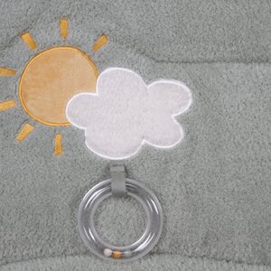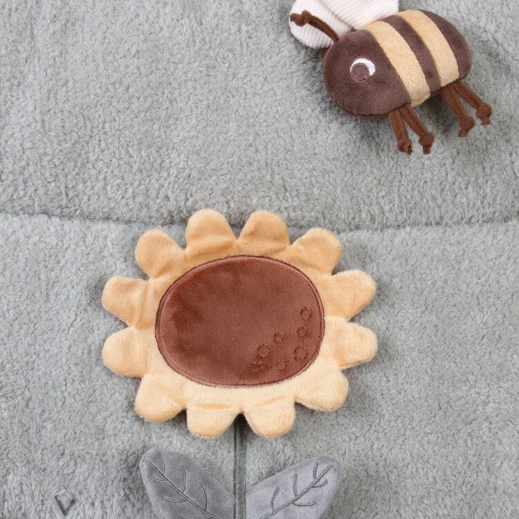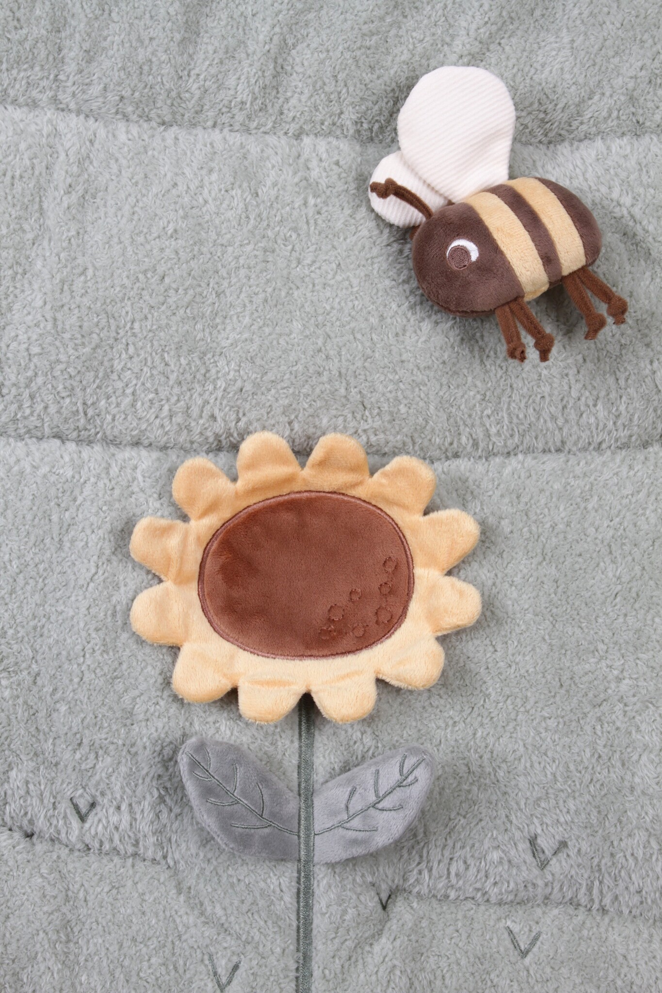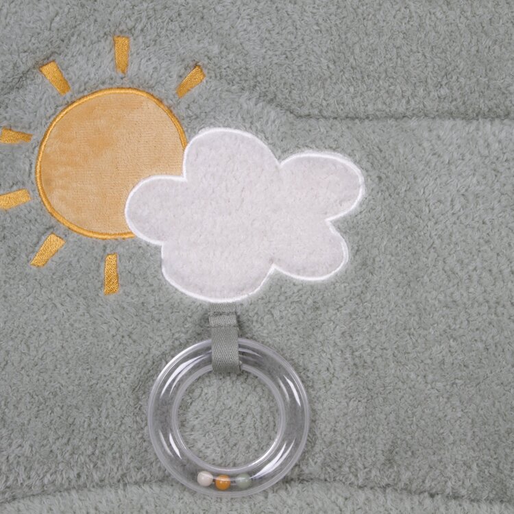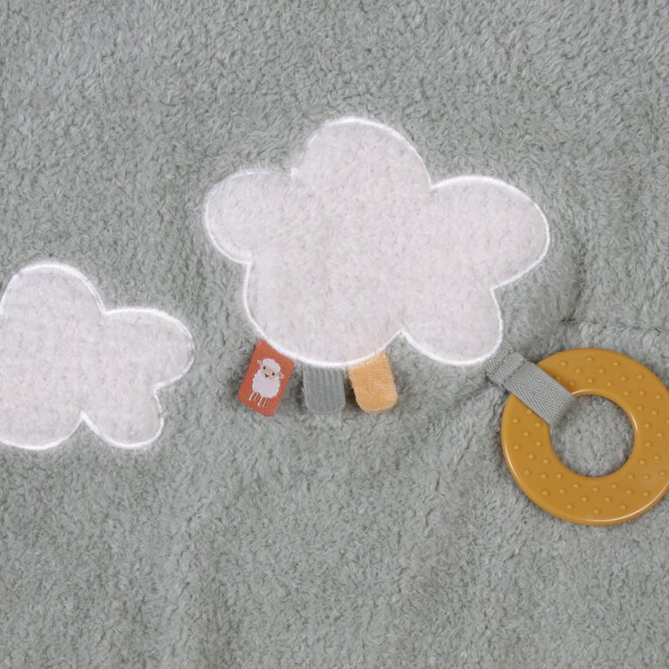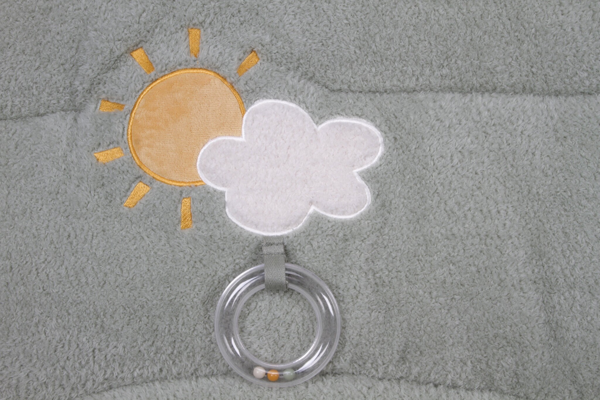 Dit gewatteerde boxkleed uit de Little Farm collectie stimuleert door de verschillende texturen en activiteiten de zintuigen van je kindje. Er valt zo veel te ontdekken en zien! De vleugels van de kip maken een knisperend geluidje, en ontdek wat er onder de vleugel zit. De wolkjes bevatten een heerlijk zachte teddy stof en er zijn diverse labels te ontdekken. Ook zit er een bijtring aan het boxkleed bevestigd.