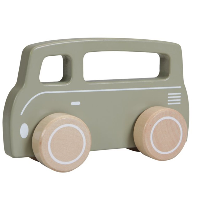 In een mooie olijf kleur rijdt dit Little Dutch busje met zijn stevige, houten wielen vrolijk rond. Hij heeft nog twee vriendjes: een auto en een sportauto. Ook leuk als accessoire in de baby- of kinderkamer.