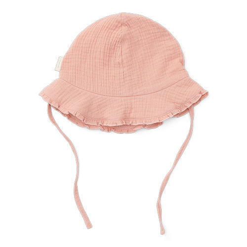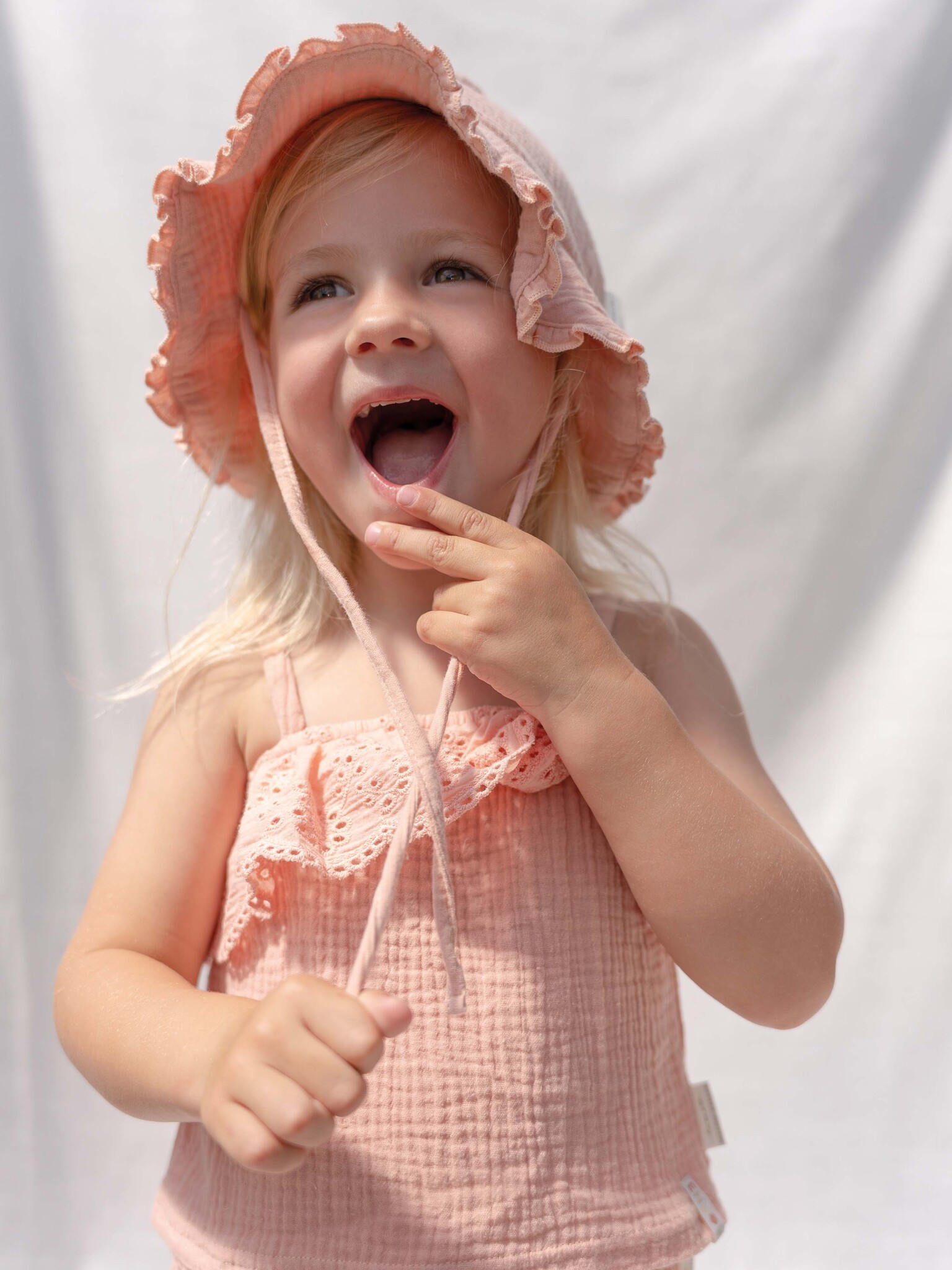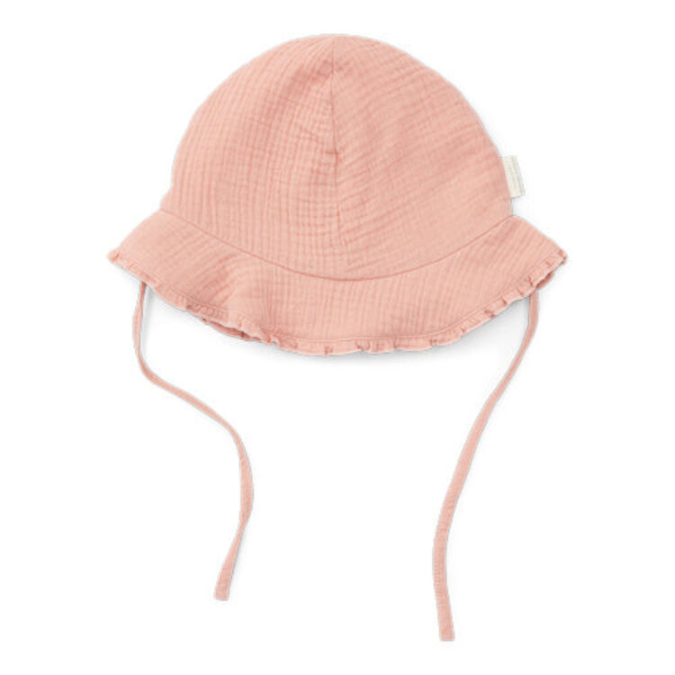 Heerlijk spelen in het zonnetje! Aan dit zachte en luchtige mousseline hoedje van biologisch katoen zitten twee koordjes om het hoedje aan het hoofdje van je kindje vast te kunnen maken.