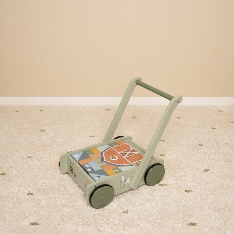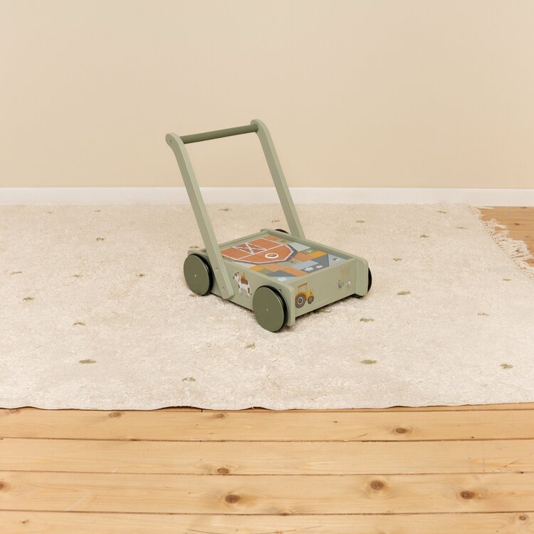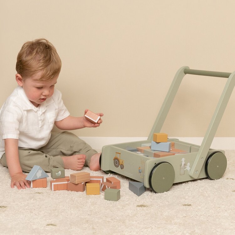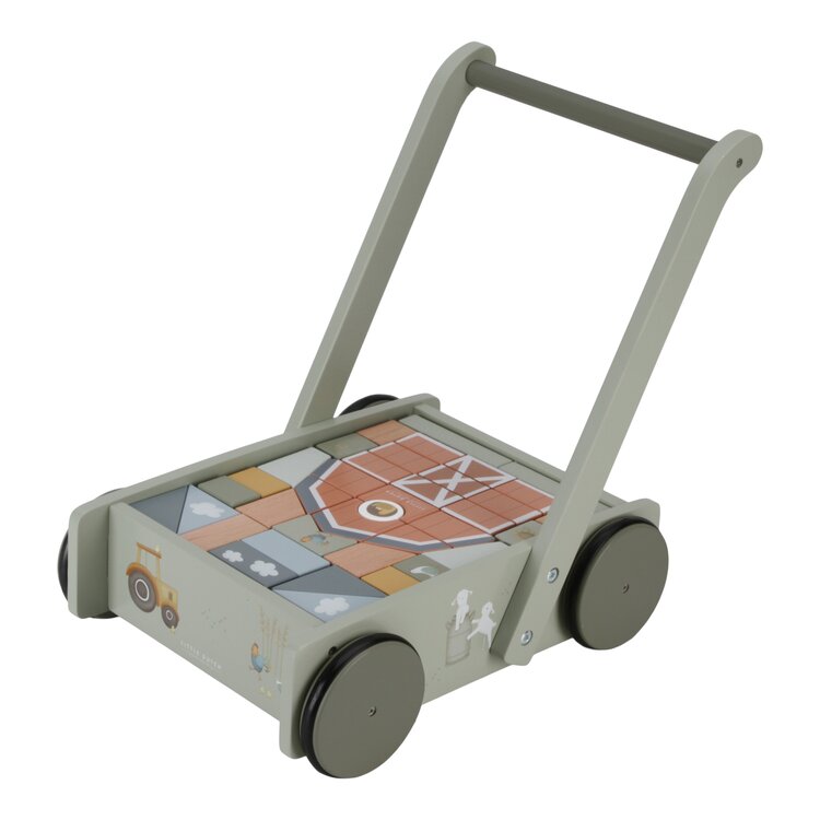 De blokkenkar is voorzien van houten wieltjes en gevuld met gekleurde houten blokken met daarop prachtige tekeningen van Farm collectie. De verschillende maten van de blokken bevorderen de herkenning van kleuren en vormen door kinderen. Het handvat zit op de juiste hoogte voor peuters zodat ze fijn door de kamer kunnen stappen. Deze vrolijke kar vol blokken staat garant voor urenlang bouwplezier.