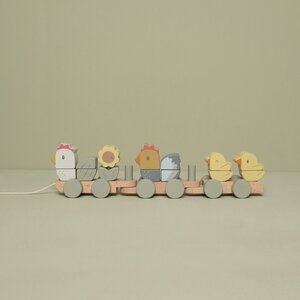 De mooie houten trein van Little Dutch is geïllustreerd met een kip en haar kuikentjes. Met de blokken in diverse vormen en kleuren kun je steeds andere kippen en kuikens maken. De trein bestaat in totaal uit 17 delen en is ± 40 cm lang. Dit speelgoed blijft leuk om mee te spelen en is tevens een leuke accessoire voor in de baby- of kinderkamer.
