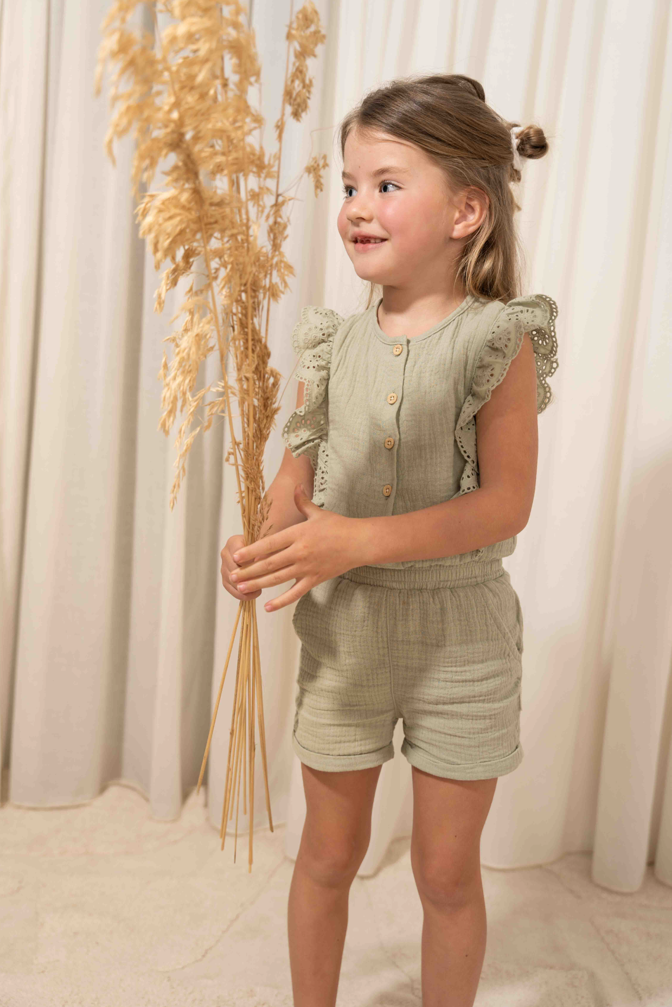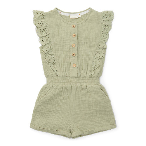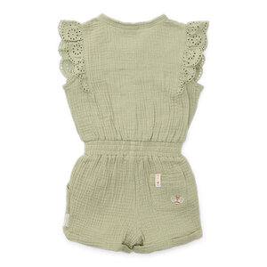 Deze vrolijke groene mousseline jumpsuit van biologisch katoen is heerlijk zacht en luchtig om te dragen. De elastische tailleband zorgt ervoor dat je de jumpsuit gemakkelijk aan en uit kunt trekken. De jumpsuit is verrijkt met schattige broderie ruches, een vrolijk borduursel op de achterzak en fijne houtlook knoopjes.