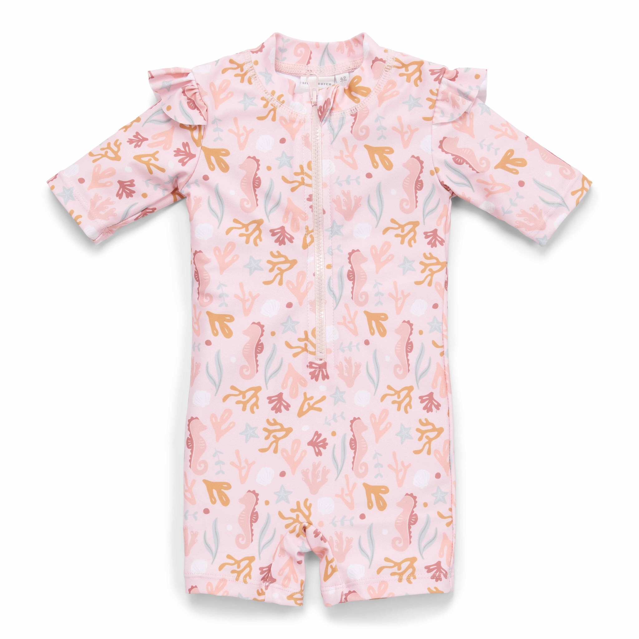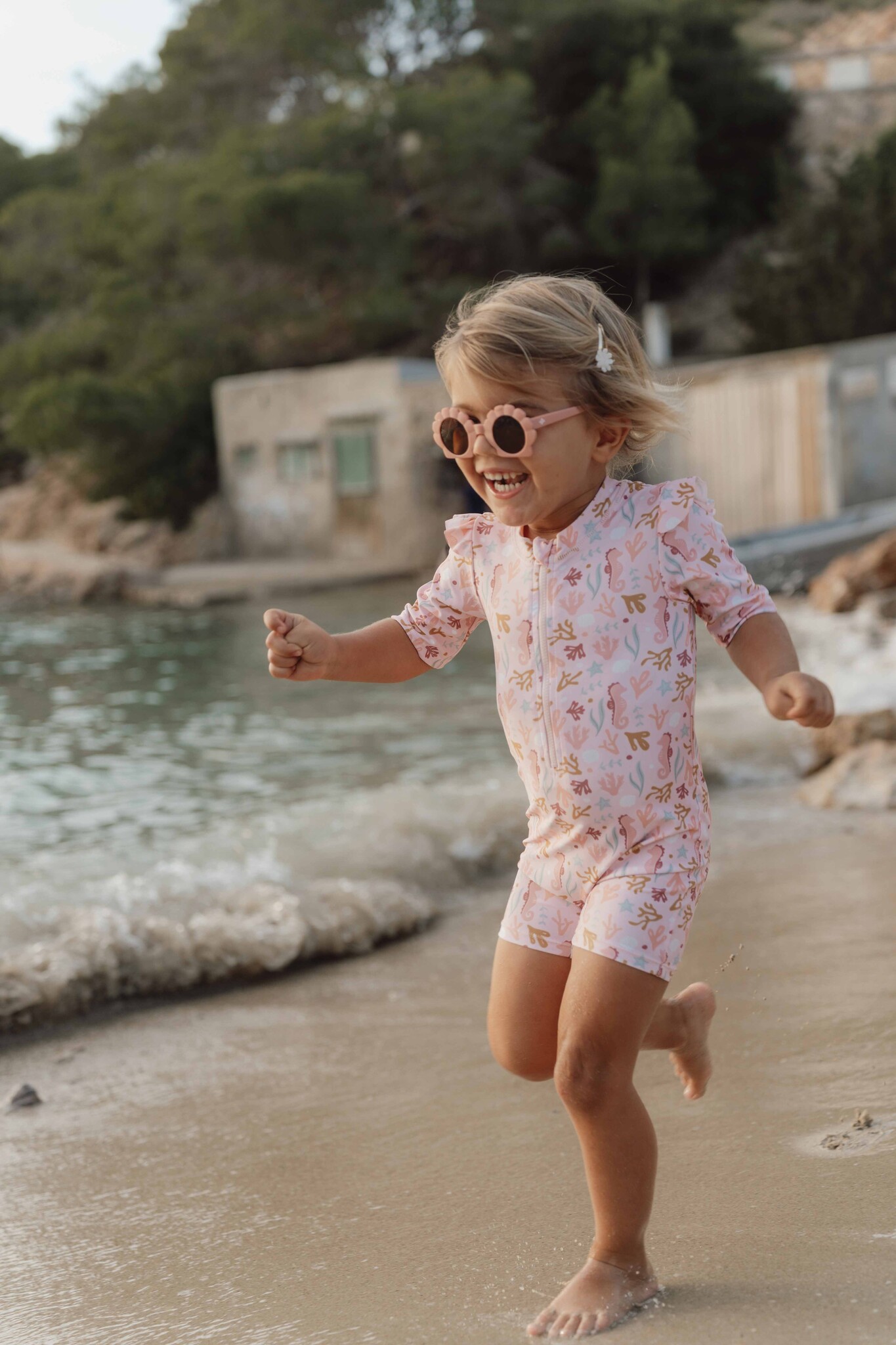 Waar is het zwembad?!? Dit schattige zwempakje van gerecycled polyester nodigt je uit om te zwemmen en te spetteren! De zachte en rekbare stof zorgt voor comfort, of je nu in het zwembad zwemt of buiten speelt in een opblaasbaar kinderzwembad.