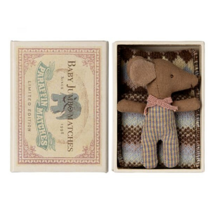 Een piepkleine muis in haar knusse luciferdoosje – zo lief dat je hart smelt. De Baby Mouse ligt zacht in haar dekentje en past perfect in kleine kinderhandjes. Een klassieker uit de Maileg-wereld die nooit verveelt.