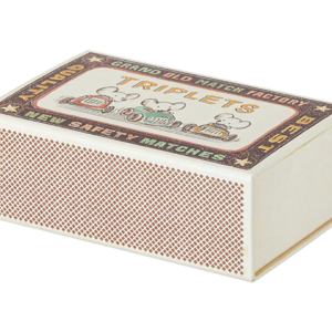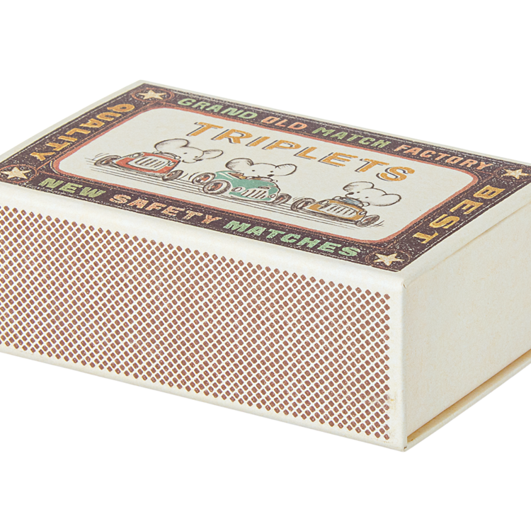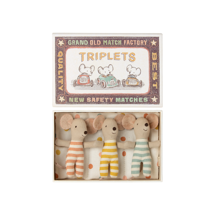 Een klassiek Maileg artikel. Nu kun je drie babymuisjes tegelijk hebben. Stop de drietal babymuisjes voorzichtig in hun luciferdoosjesbedje in de warme slaapzak waar ze dicht tegen elkaar aan slapen. Deze muisjes passen op alle accessoires in de maat babymuis.