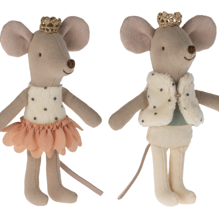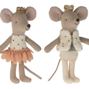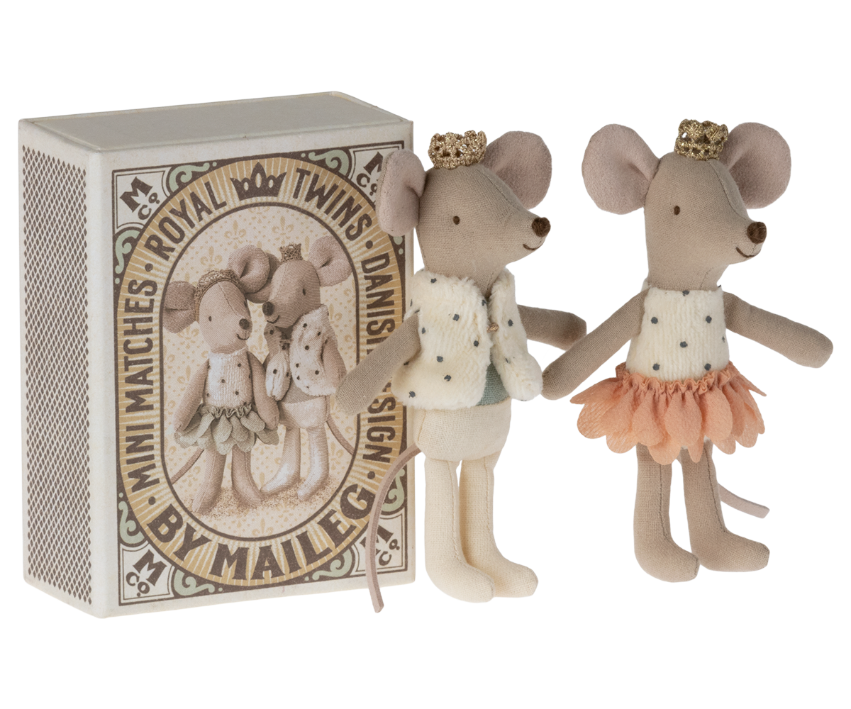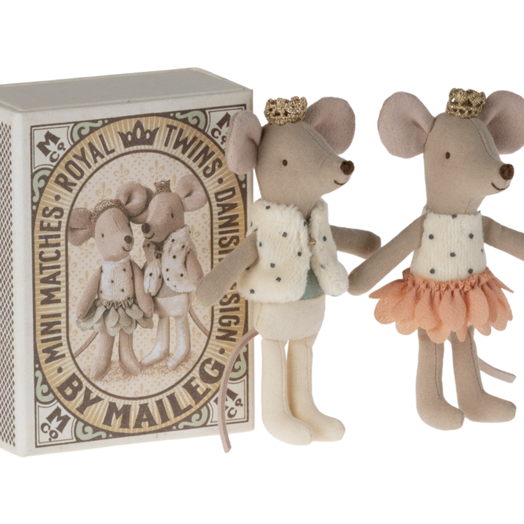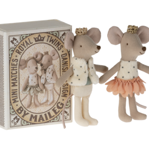 De koninklijke muizenfamilie wordt groter met deze tweeling. Ze dragen gouden kronen en prachtige kleren. Ze slapen in een mooi versierd luciferdoosje en passen perfect in het Maileg kasteel.