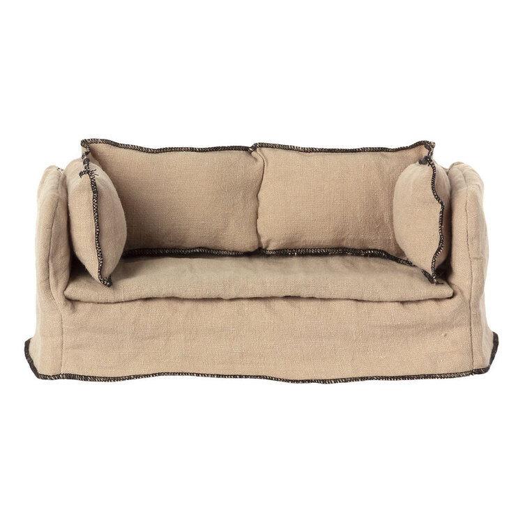 Deze linnen bank past mooi in een poppenhuis of in het Maileg kasteel met keuken en de bijpassende koffietafel.