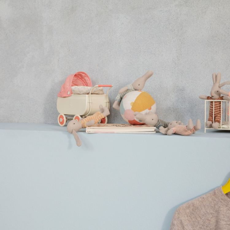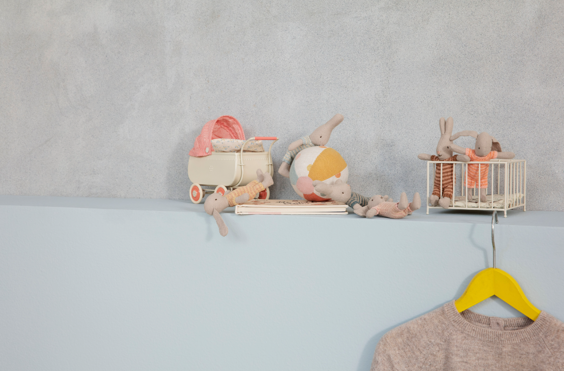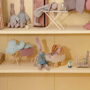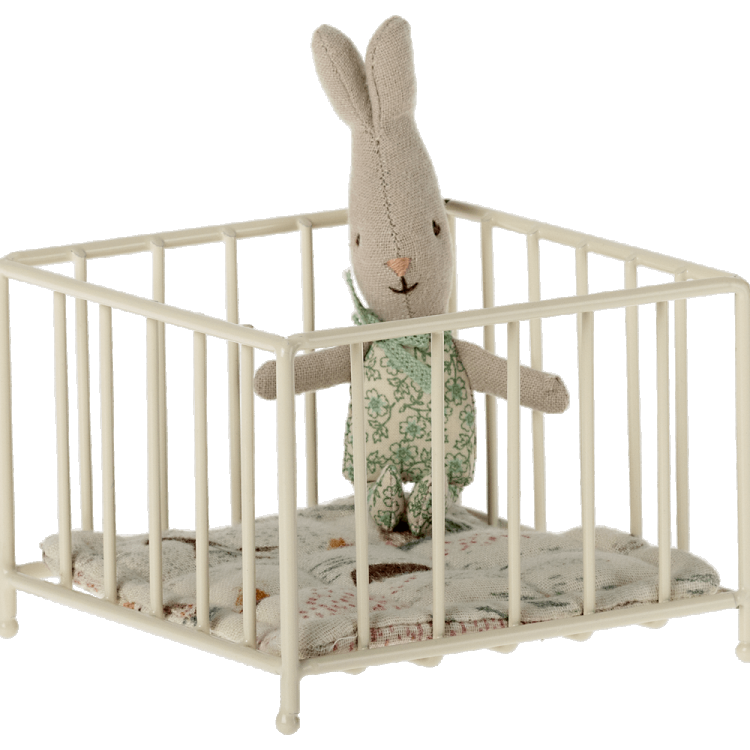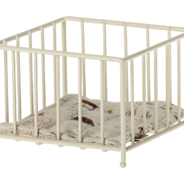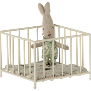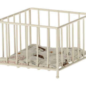 Keep your baby safe in a sweet playpen. This size fits all friends in size MY perfectly. The playpen is in metal and painted in a soft off-white tone. In the bottom is a soft mattress covered with unique Maileg fabric.