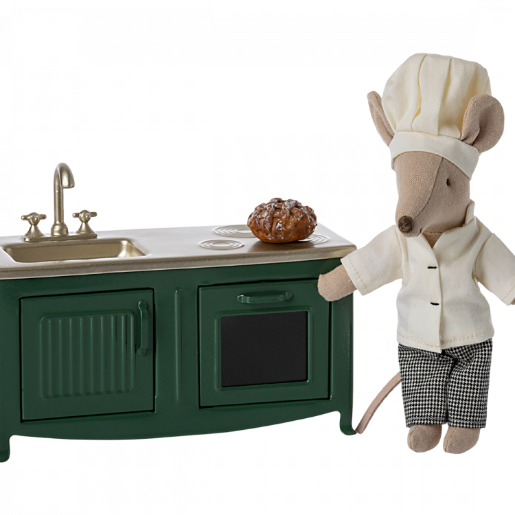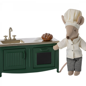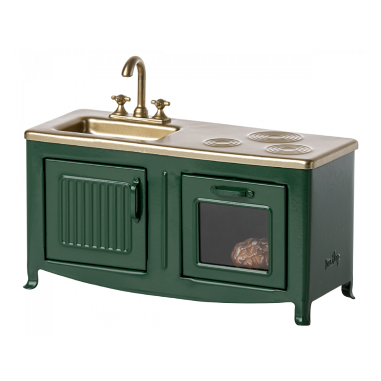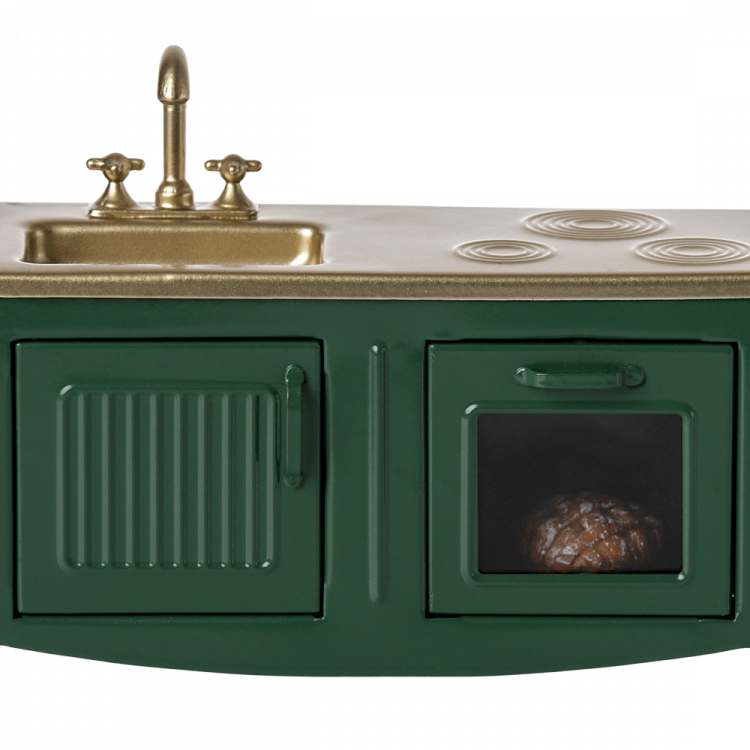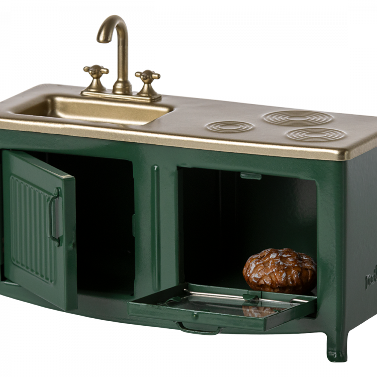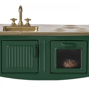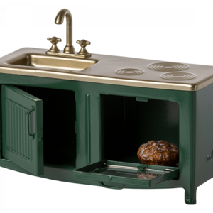Het hart van elk huis is de keuken. Deze metalen keuken heeft een mooie kleurtint en heeft veel speelse details zoals een kastdeur, gootsteen en een oven met een vers gebakken taart. Het formaat is perfect voor de muizenfamilie.