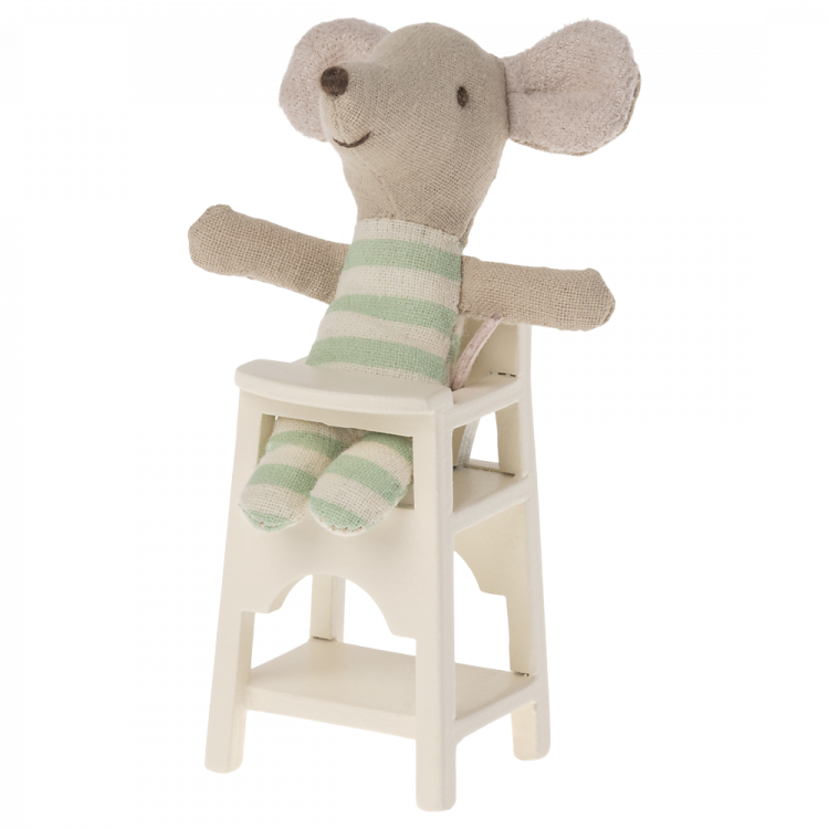 A classic Maileg accessory. This high chair is a must have for all families with babies so the small one can particiate in the meals. Fits baby mice.