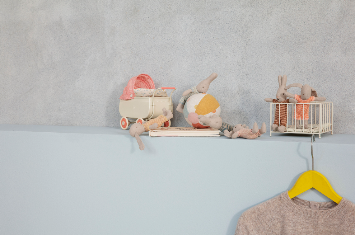A beautiful Maileg pram with an exclusive vintage look. The metal part has embossed details on the sides, and the fabric cover fulfills the look. The pram is perfect for a walk when the baby sleeps.