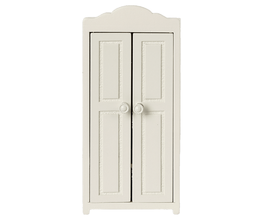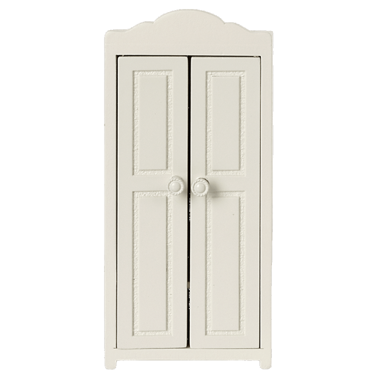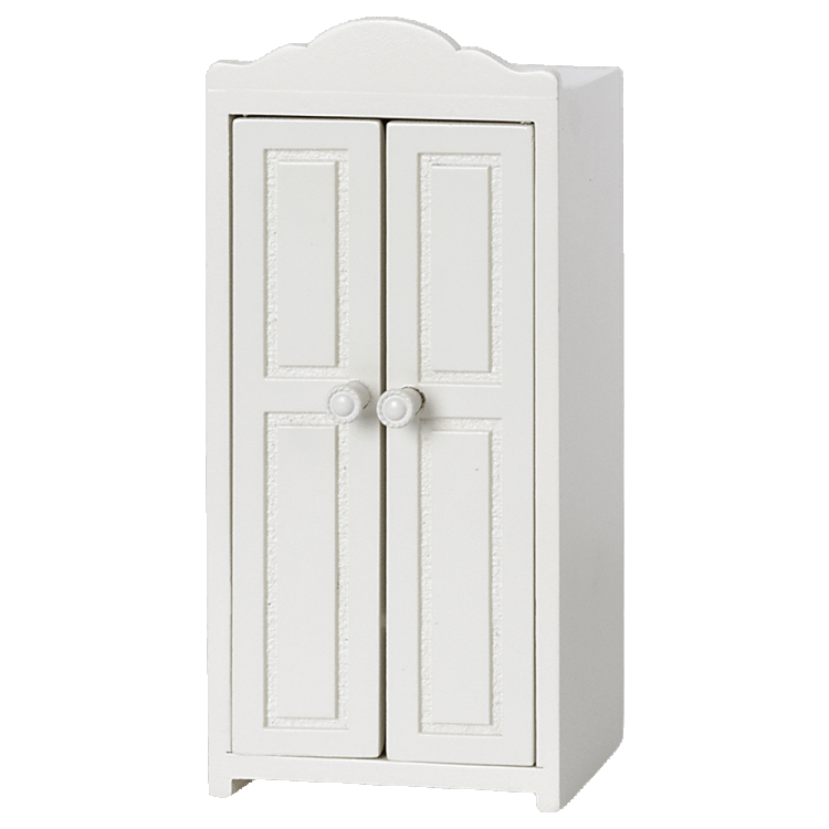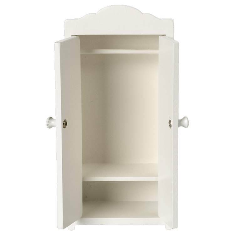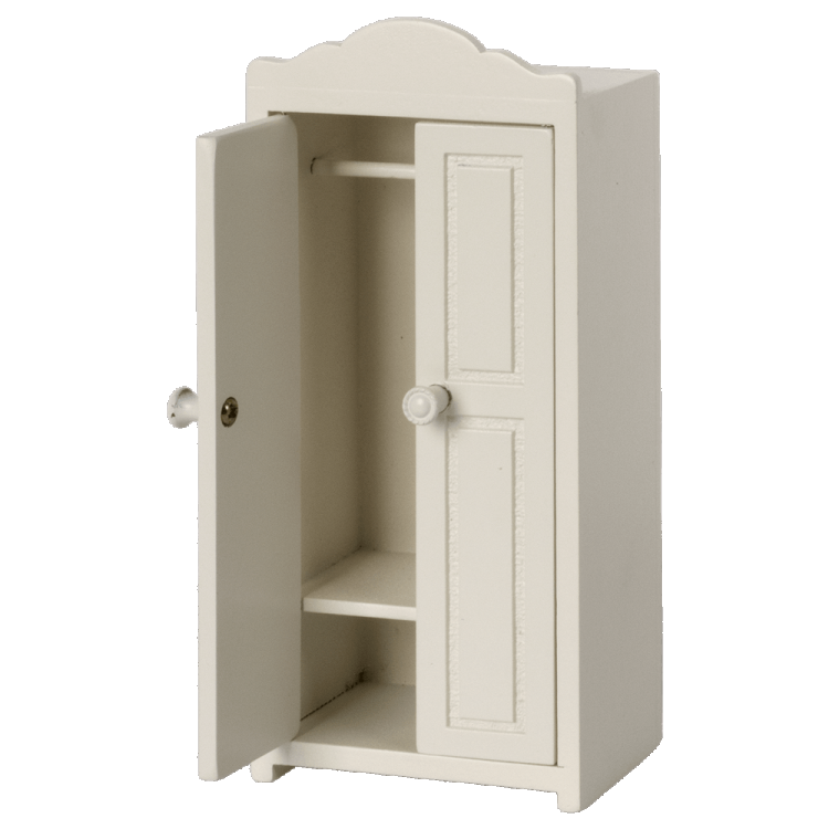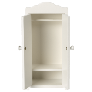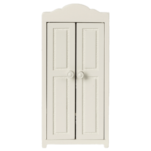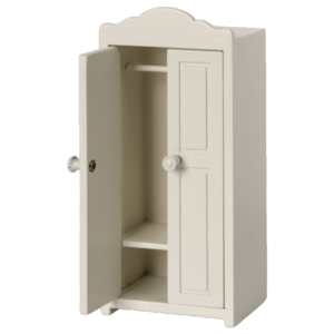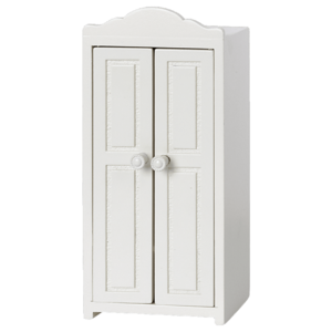De Maileg Miniatuur Kledingkast is een prachtig vormgegeven houten kast die perfect past in het Maileg-poppenhuis. Deze witte kast, met een hoogte van 16 cm en een breedte van 7 cm, biedt voldoende ruimte om de garderobe van je Maileg-muizen en -konijntjes netjes op te bergen. De kast is voorzien van een legplank en een kledingroede, compleet met drie gouden kleerhangertjes voor het ophangen van kledingstukken.