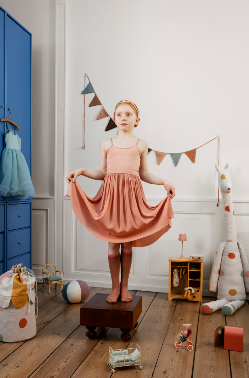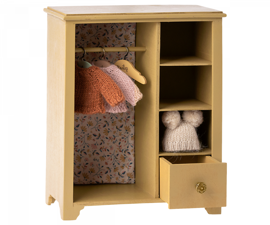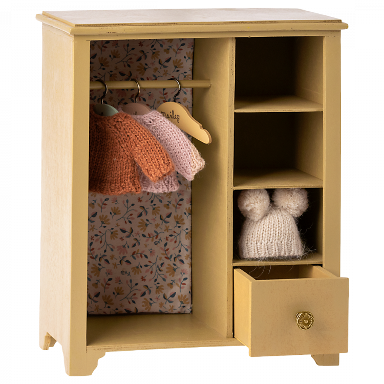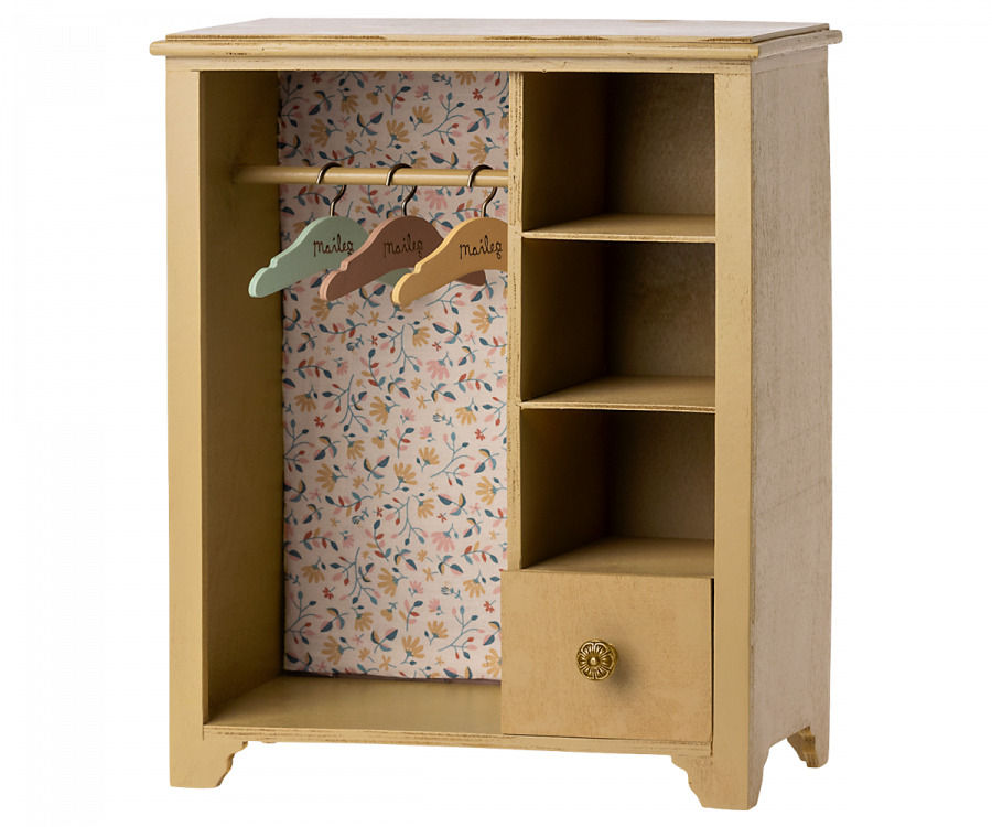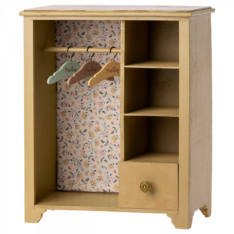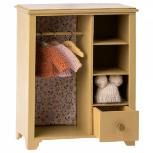 In deze grote kast kunnen je Maileg vrienden hun kleding en accessoire kwijt. Het heeft mooie details zoals de 3 kleine hangers in verschillende kleuren, en een mooie Maileg stof bedekt de achterwand van de kast.