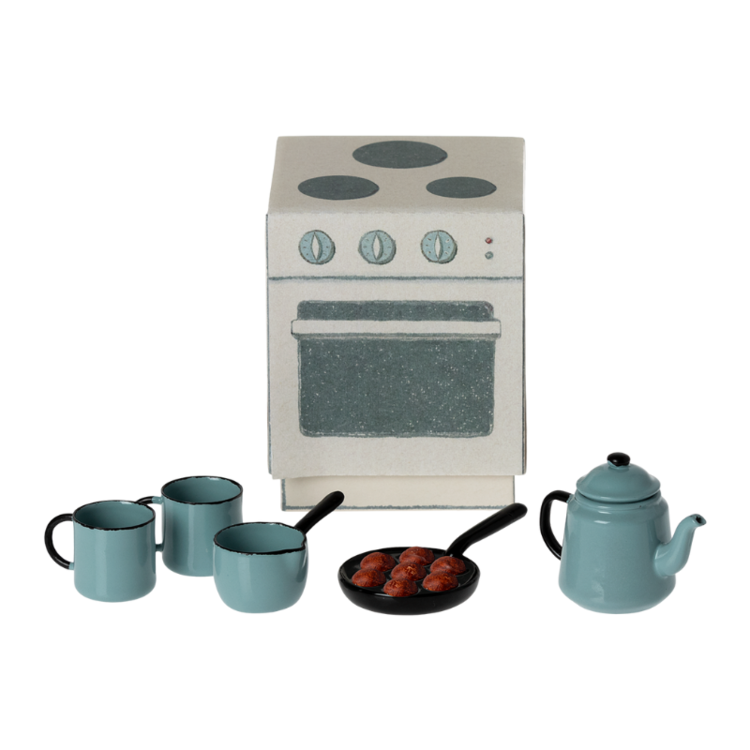 Een miniatuur kookset met alle favorieten van Madam Blue. Een blikje en twee kopjes, een steelpan en een pan met heerlijke soesjes, een traditionele scandinavische traktatie in de winter. Al deze onderdelen zitten in een papieren doosje dat eruitziet als een fornuis.