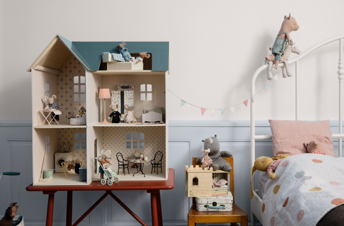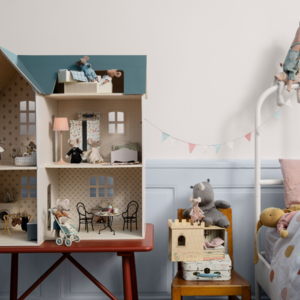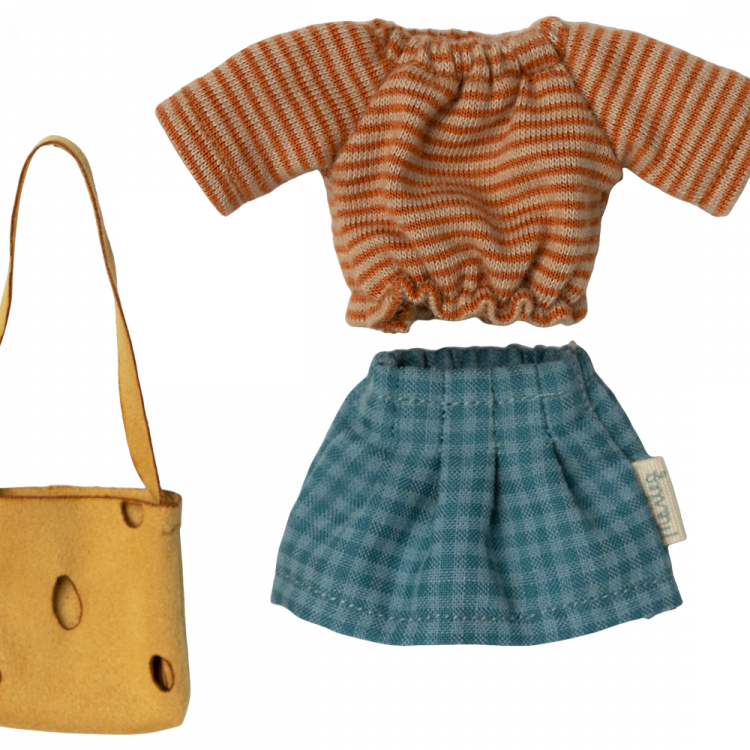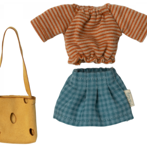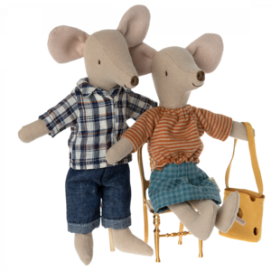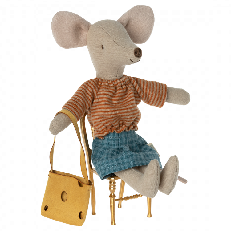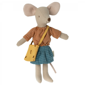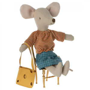 A classic Maileg item; Mum mouse, now in new clothes. This mouse fits furniture and accessories in size mouse. Buy more clothes separately, clothes in size mum/dad fit this mouse.