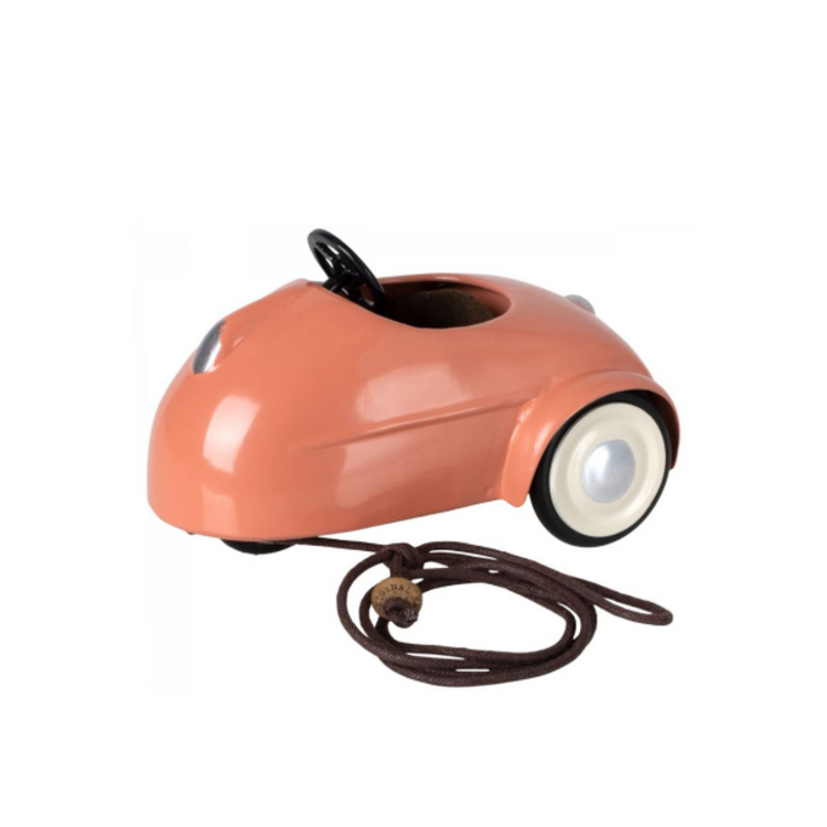 De muizen racen stijlvol rond in deze prachtige koraalkleurige auto. Het retro ontwerp en de soepele wieltjes maken elke rit een feestje. Perfect passend bij de Maileg garage en muizenfamilie.