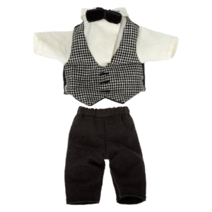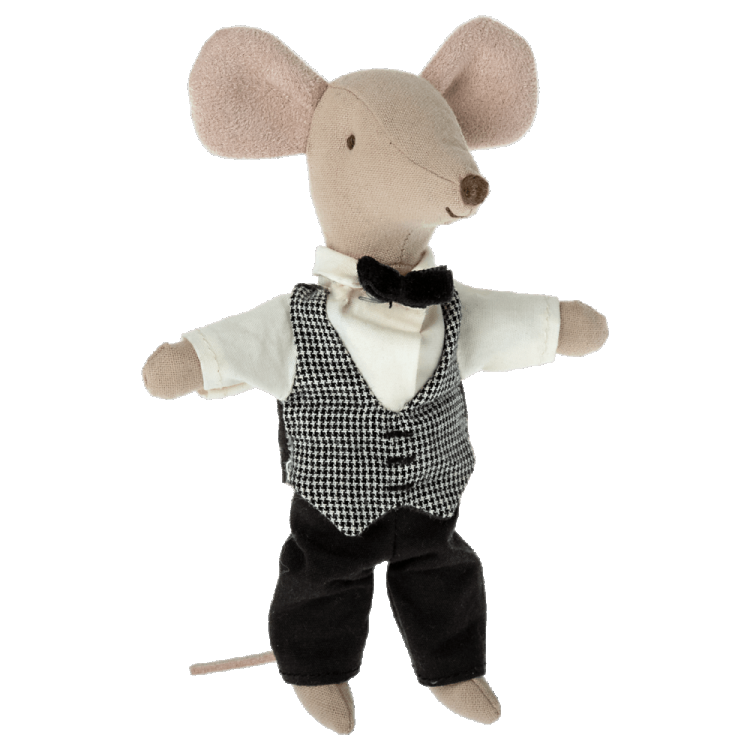 De Maileg Ober Muis is een charmante toevoeging aan de Maileg-collectie, ontworpen om fantasierijk spel te stimuleren. Deze grote broer muis is gekleed in een elegant oberkostuum, bestaande uit een geruite gilet, een strikje, een witte blouse en zwarte broek. Zijn handjes bevatten magneten, waardoor hij metalen accessoires kan vasthouden en realistische speelscenario's mogelijk maakt.
