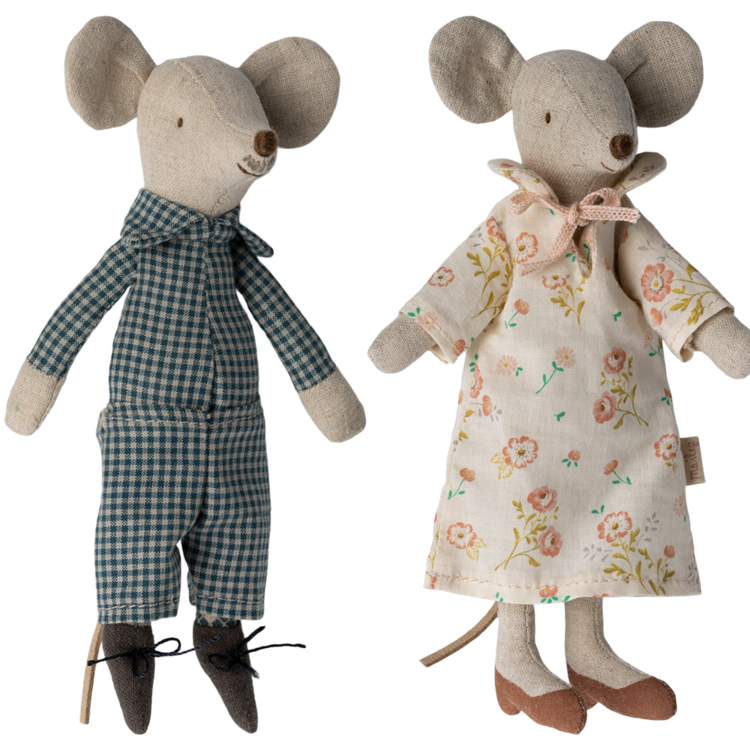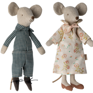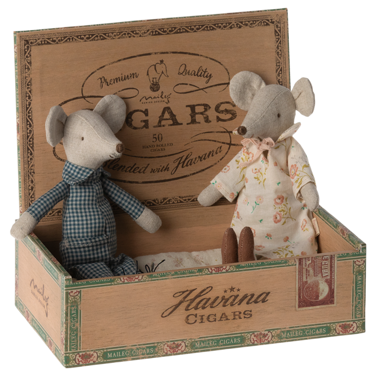 Een klassiek Maileg muis item. Opa en oma dragen hun nachtkleding, oogmaskers en mooie schoenen. De sigarendoos is een perfect bed voor een goede nachtrust. Breid hun garderobe uit met sets losse kleding om een perfecte speelset te maken.