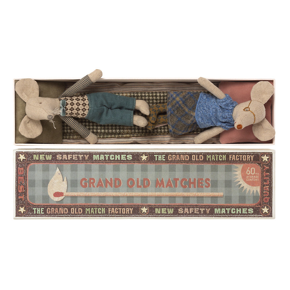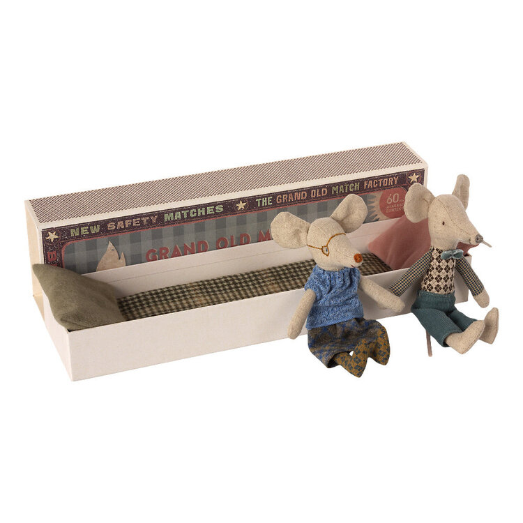 Maak je muizen familie compleet met de Maileg opa en oma muisjes. Opa en oma slapen graag in hun luciferdoos met hierin een matrasje, dekentje en kussentjes. Lekker comfortabel. Maileg opa en oma zijn 17 cm hoog.