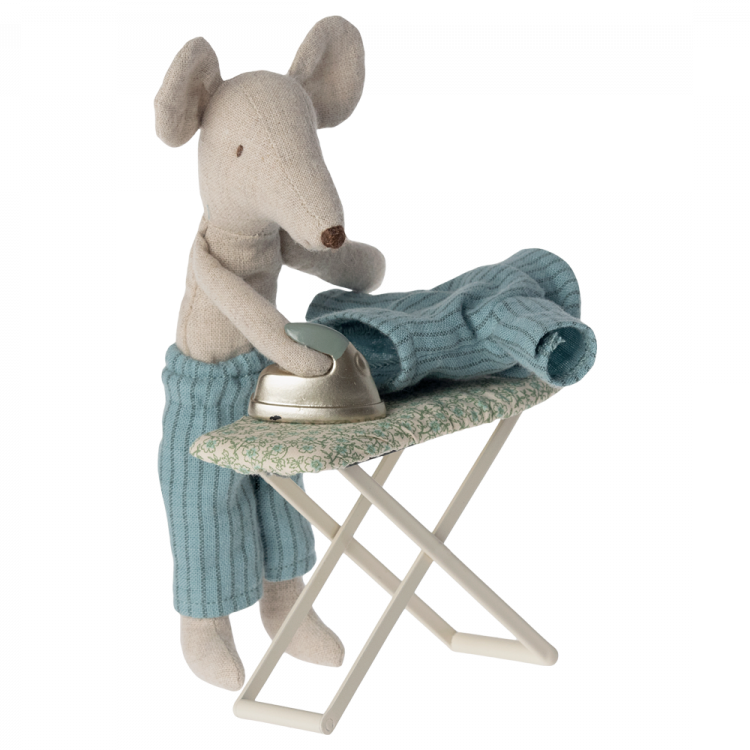 Om de wasruimte volledig uitgerust te maken, moet je een strijkijzer en strijkplank hebben. Deze set maakt het spel nog authentieker. De strijkplank is gemaakt van metaal en bekleed met unieke Maileg-stof. Het formaat is perfect voor de muizenfamilie.