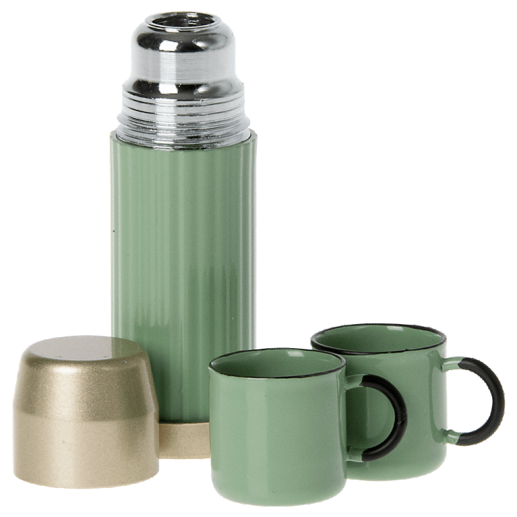 De Maileg Thermos en Kopjes set in mintgroen is een charmante aanvulling op de avonturen van je Maileg-muizen en -konijntjes. Deze set bestaat uit een metalen thermosfles met een afschroefbare dop en twee bijpassende kopjes, allemaal uitgevoerd in een prachtige vintage stijl. Met een hoogte van 6 cm is de thermos perfect afgestemd op de Maileg-figuren.
