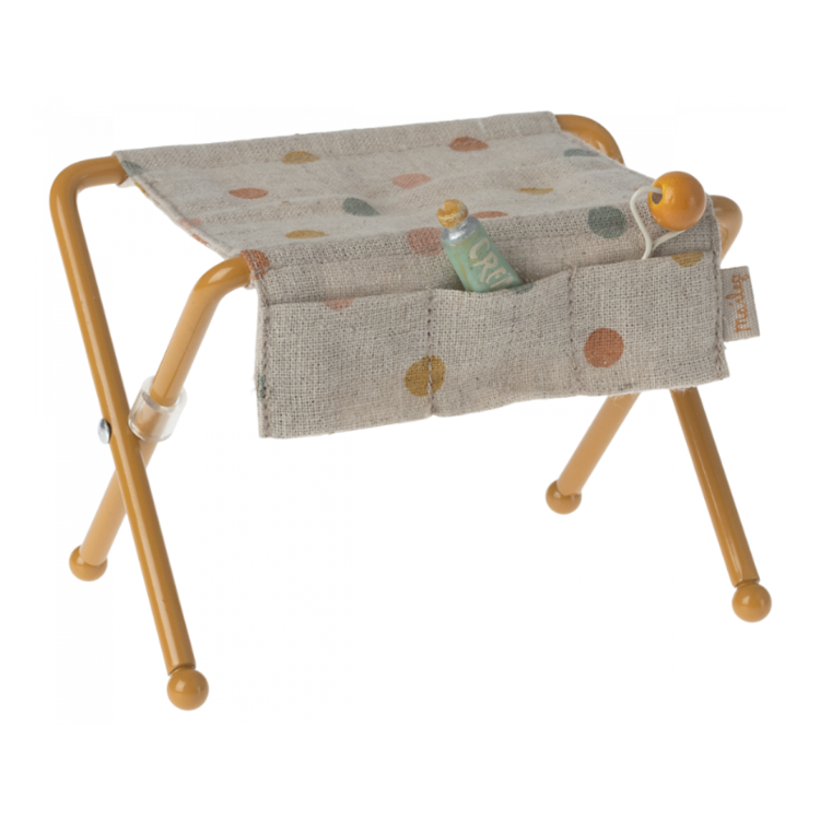 De Maileg Verschoontafel in een warme okergele kleur is de perfecte aanvulling op het Maileg-poppenhuis. Met zijn klassieke ontwerp en zachte stofdetails creëert het een realistische plek om de kleine Maileg-baby’s te verschonen en te verzorgen. Ideaal voor fantasierijk rollenspel waarbij kinderen de dagelijkse zorgmomenten van hun muisjes en konijntjes naspelen.