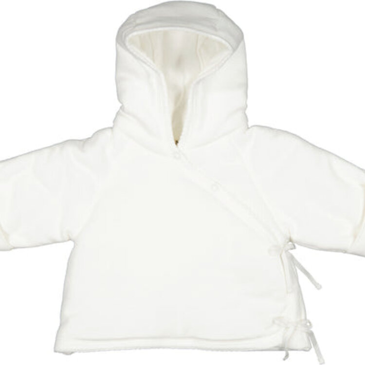 Leuk en warm wikkeljasje met een capuchon. Het jasje wordt gesloten met zowel drukknopen als linten. De mouwen kunnen worden omgeslagen om de baby warm en knus te houden.