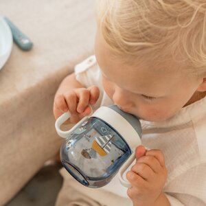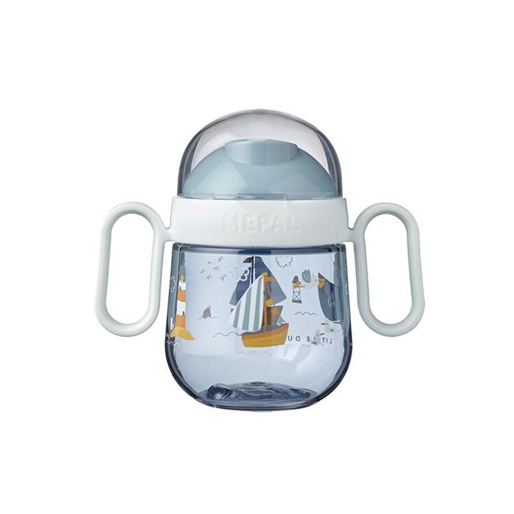 Fijne antilekbeker Mepal Mio met een inhoud van 200 ml. De beker heeft extra korte drinktuitjes en een drinkopening aan twee kanten van de deksel.