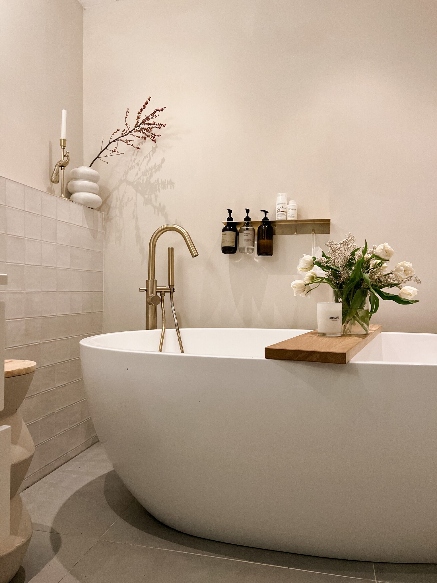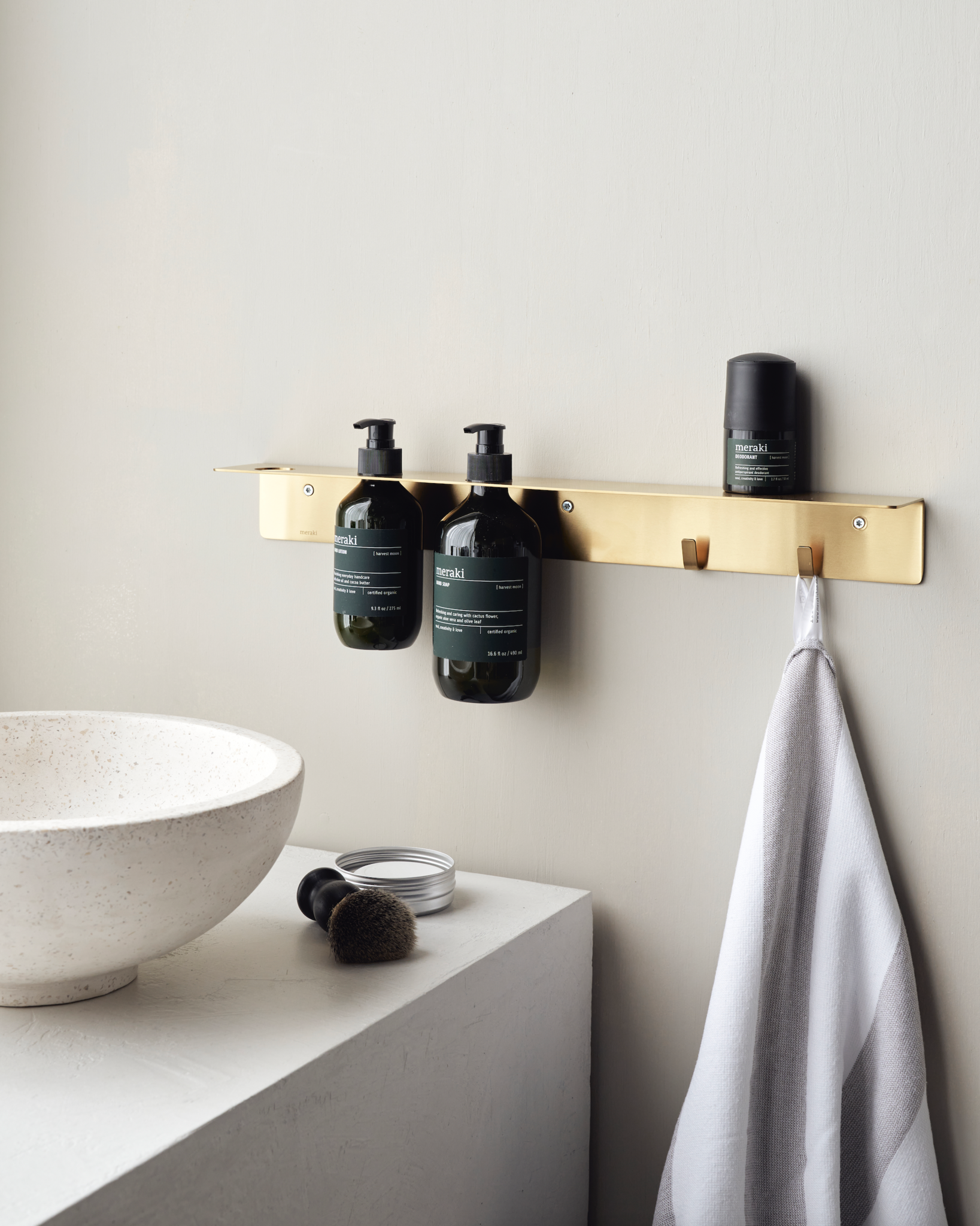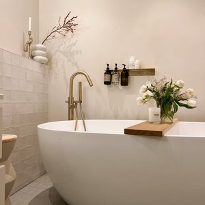 Maak ruimte vrij en geef je badkamer een frisse update met deze flessenhanger met haken. De haken bieden opbergruimte voor 3 flessen, je loofah of andere accessoires en op de plank erboven kun je meer producten kwijt. Het roestvrij staal heeft een elegante geborstelde messing afwerking die geen water doorlaat. Of je hem nu in de douche of aan de badkamermuur hangt, de flessenhanger van Meraki is een stijlvolle toevoeging aan je badkamer.
