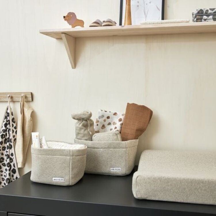 De commodemand is verkrijgbaar in diverse kleuren en in een small en medium variant met de afmetingen: small 21x16xh16 cm en medium 26x19xh16 cm. De binnenkant kun je afnemen met een vochtig doekje. Dus mocht er een flesje of potje lekken dan is er niets aan de hand en maak je het zo weer schoon. Mix en match het mandje met de rest van de Meyco Baby collectie en creëer een complete look in de babykamer.