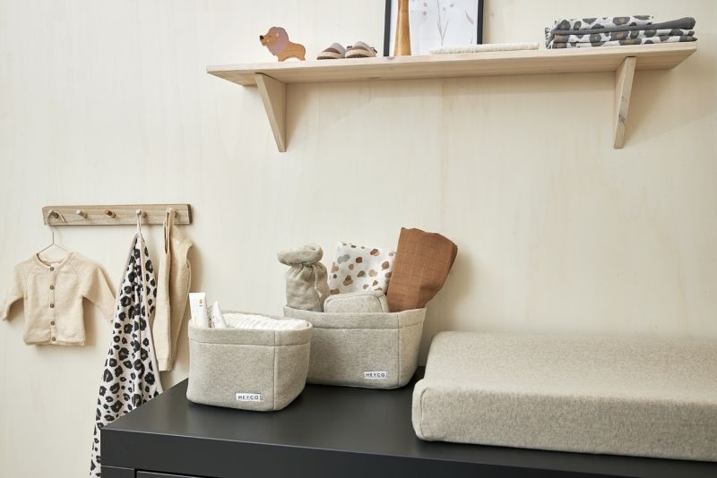 De commodemand is verkrijgbaar in diverse kleuren en in een small en medium variant met de afmetingen: small 21x16xh16 cm en medium 26x19xh16 cm. De binnenkant kun je afnemen met een vochtig doekje. Dus mocht er een flesje of potje lekken dan is er niets aan de hand en maak je het zo weer schoon. Mix en match het mandje met de rest van de Meyco Baby collectie en creëer een complete look in de babykamer.