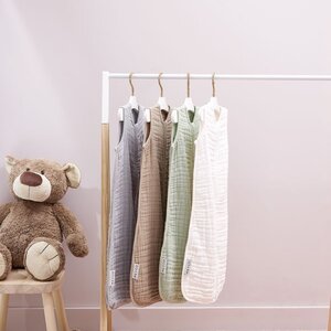 De babyslaapzak is gemaakt van 100% pre-washed hydrofiel katoen en daardoor perfect voor het gebruik tijdens de warmere zomerdagen en -nachten. Het hydrofiel katoen ademt namelijk zeer goed, heeft een uitstekende vochtopname en droogt zeer snel. Zo blijft het slaapklimaat van je kleintje tijdens de warme dagen en nachten op een perfecte temperatuur, zonder dat hij of zij het te warm krijgt.