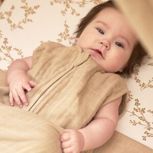 De babyslaapzak is gemaakt van 100% pre-washed hydrofiel katoen en daardoor perfect voor het gebruik tijdens de warmere zomerdagen en -nachten. Het hydrofiel katoen ademt namelijk zeer goed, heeft een uitstekende vochtopname en droogt zeer snel. Zo blijft het slaapklimaat van je kleintje tijdens de warme dagen en nachten op een perfecte temperatuur, zonder dat hij of zij het te warm krijgt.