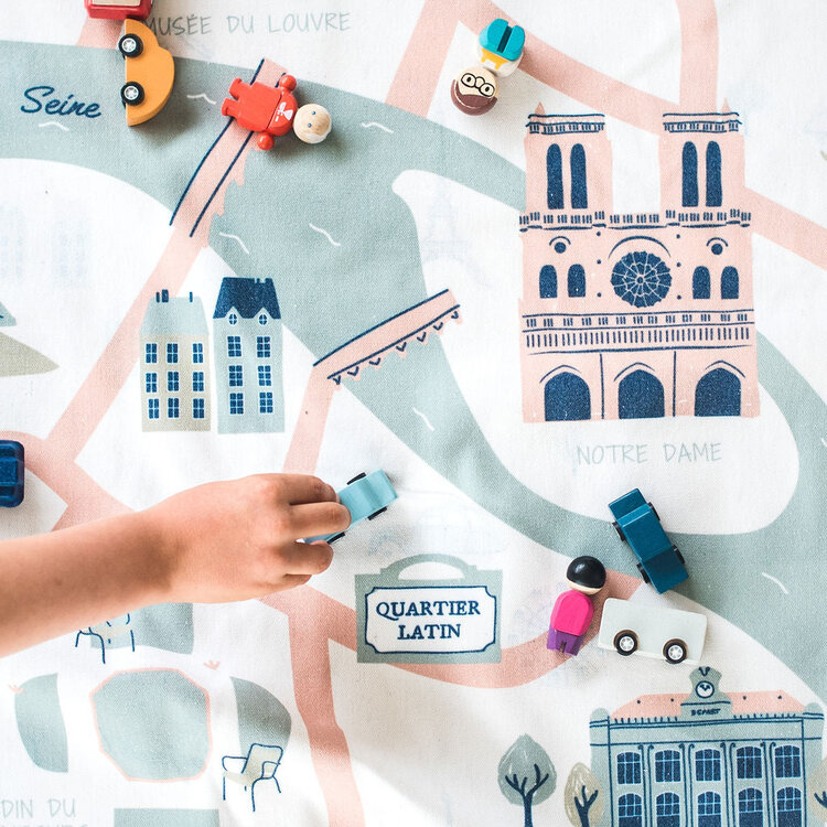 Bonjour, greetings from Paris! Neem je speelgoed mee op reis door Frankrijk en loop met ze door de straten van Parijs met dit dubbelzijdige speelkleed.