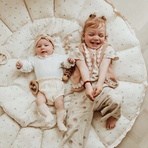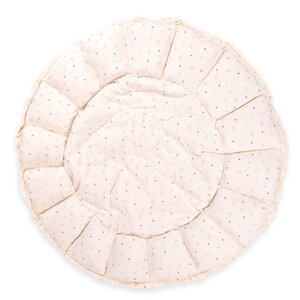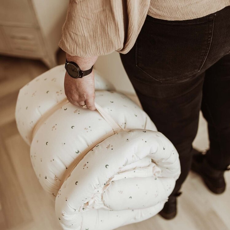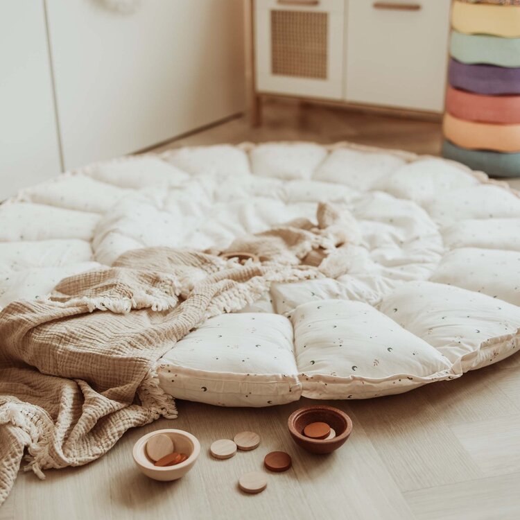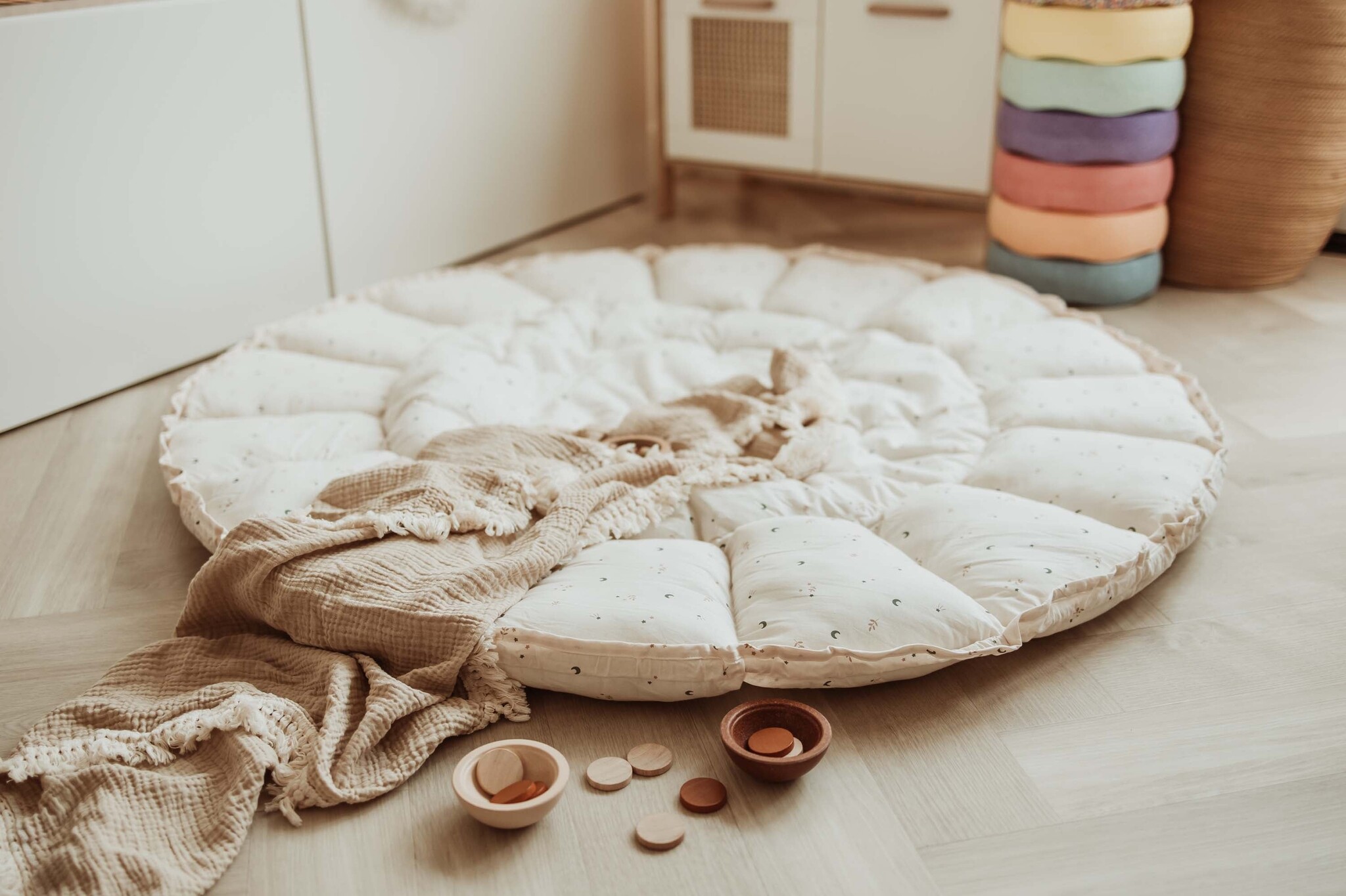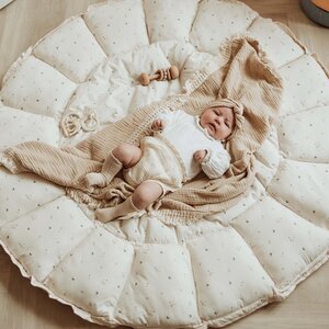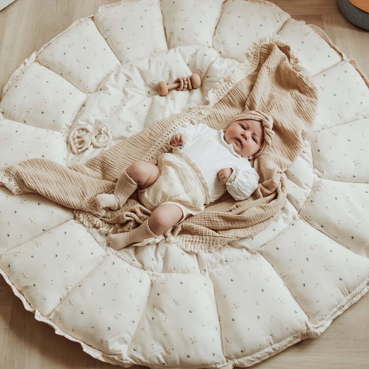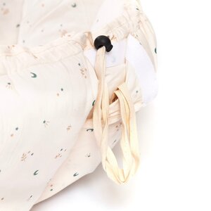 Een gewatteerde 3-in-1 speelkleed Bloom. Als de bloemen bladen naar beneden zijn. is de bloom babymat een groot, zacht speelkleed. Door het koord aan te trekken komen de gestulpte randen omhoog te staan, waardoor er een behaaglijk en veilig babynest ontstaat. wanneer er niet in wordt gespeeld kan het speelkleed ook gebruikt worden om speelgoed in op te bergen of in tentoon te stellen.