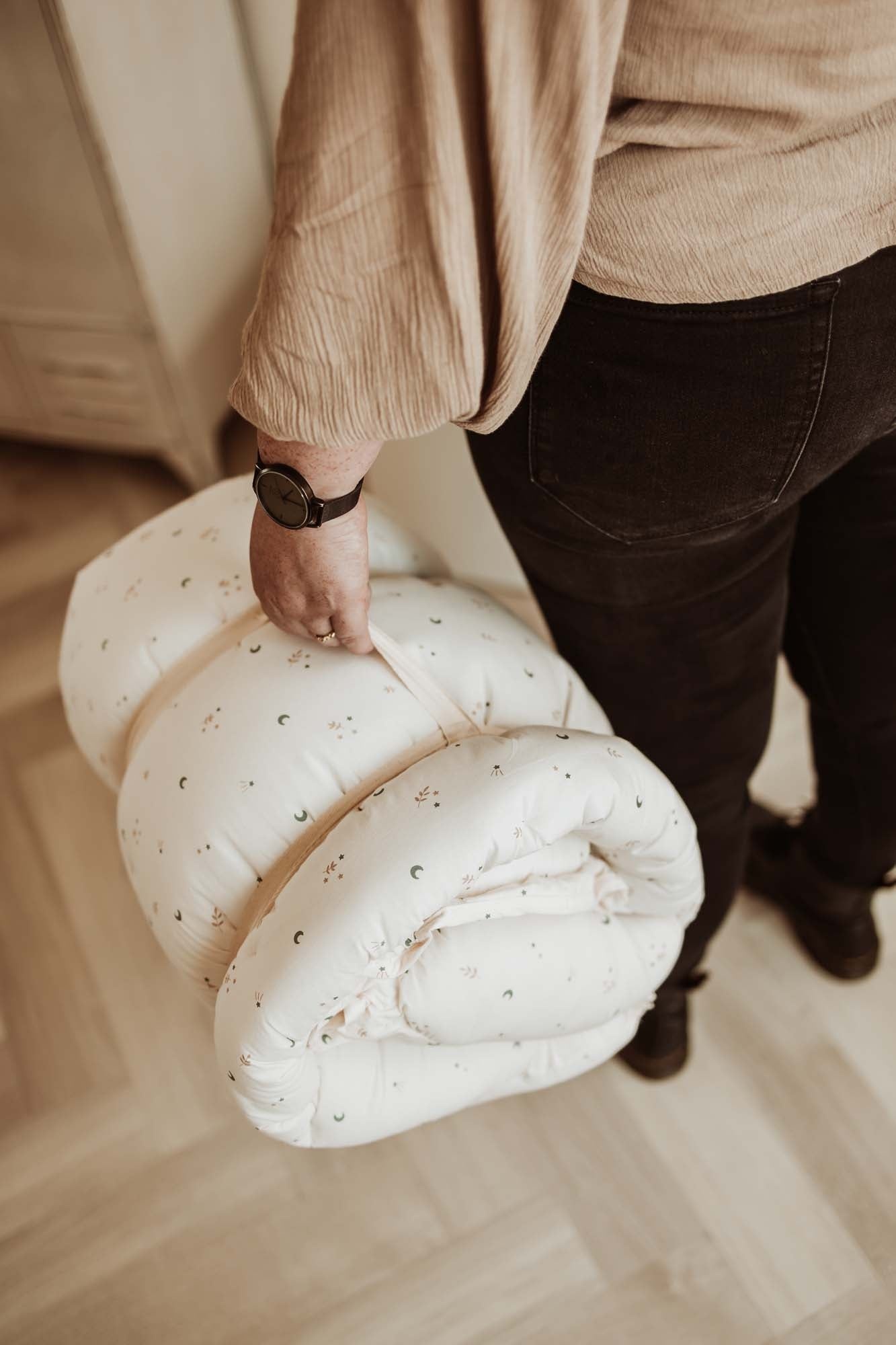 het licht gewichten speelkleed is gemakkelijk op te vouwen en mee te nemen door middel van een draagriem.