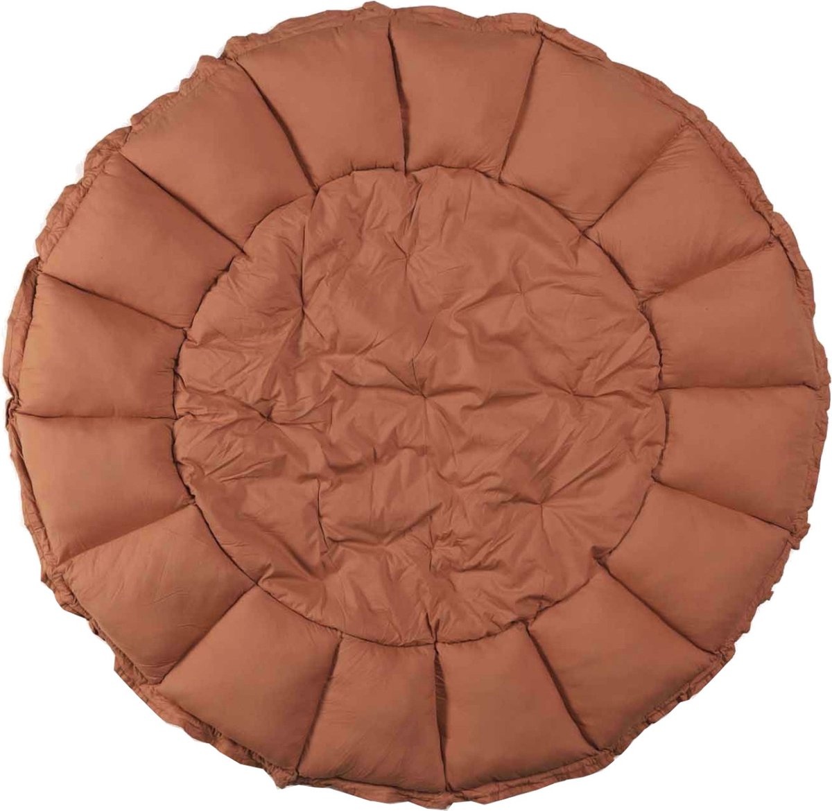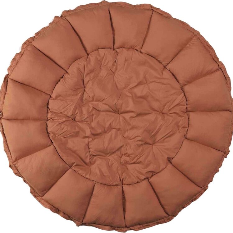 Een gewatteerde 3-in-1 speelkleed Bloom. Als de bloemen bladen naar beneden zijn. is de bloom babymat een groot, zacht speelkleed. Door het koord aan te trekken komen de gestulpte randen omhoog te staan, waardoor er een behaaglijk en veilig babynest ontstaat. wanneer er niet in wordt gespeeld kan het speelkleed ook gebruikt worden om speelgoed in op te bergen of in tentoon te stellen.