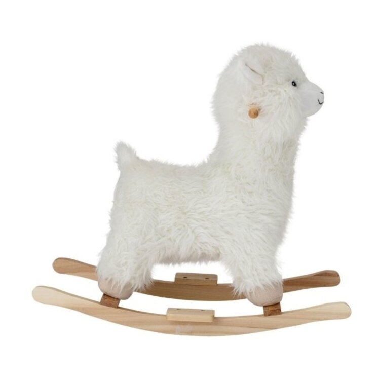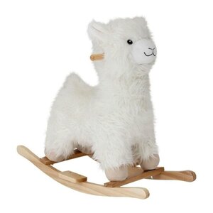 De Lama met een hoogte van 65 cm is gemaakt van polyester, het schommelframe is gemaakt van populierenhout.