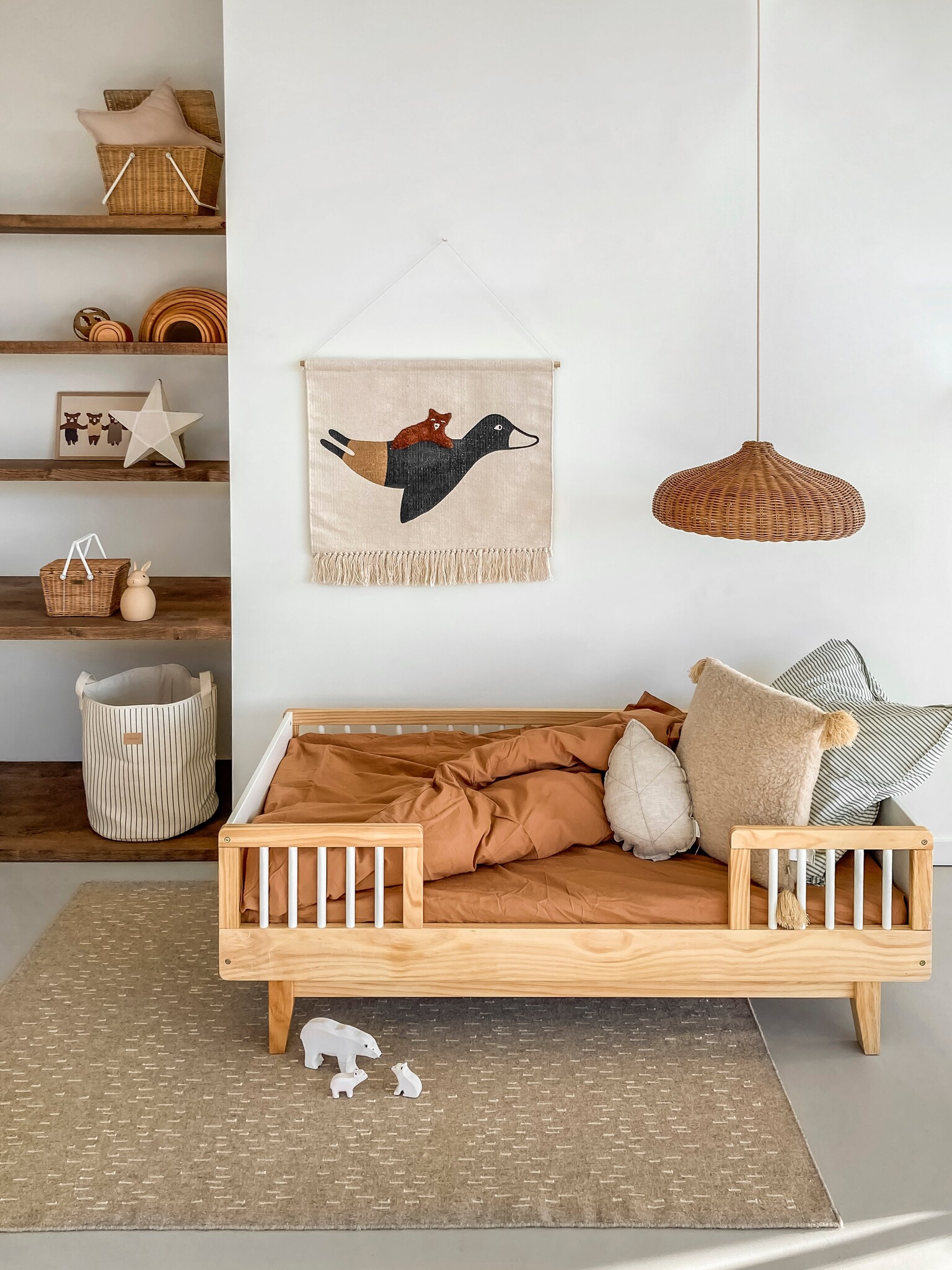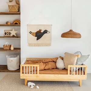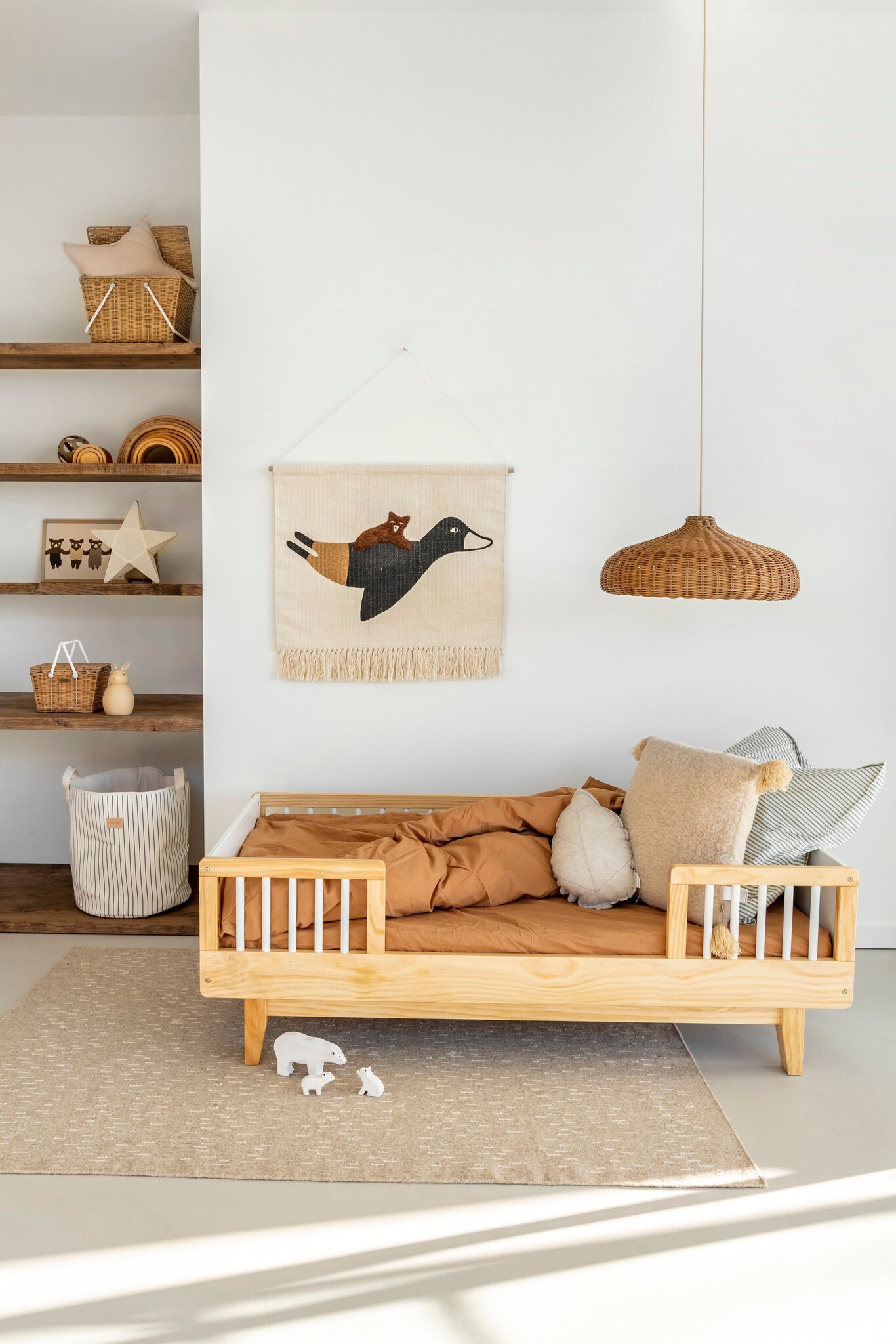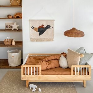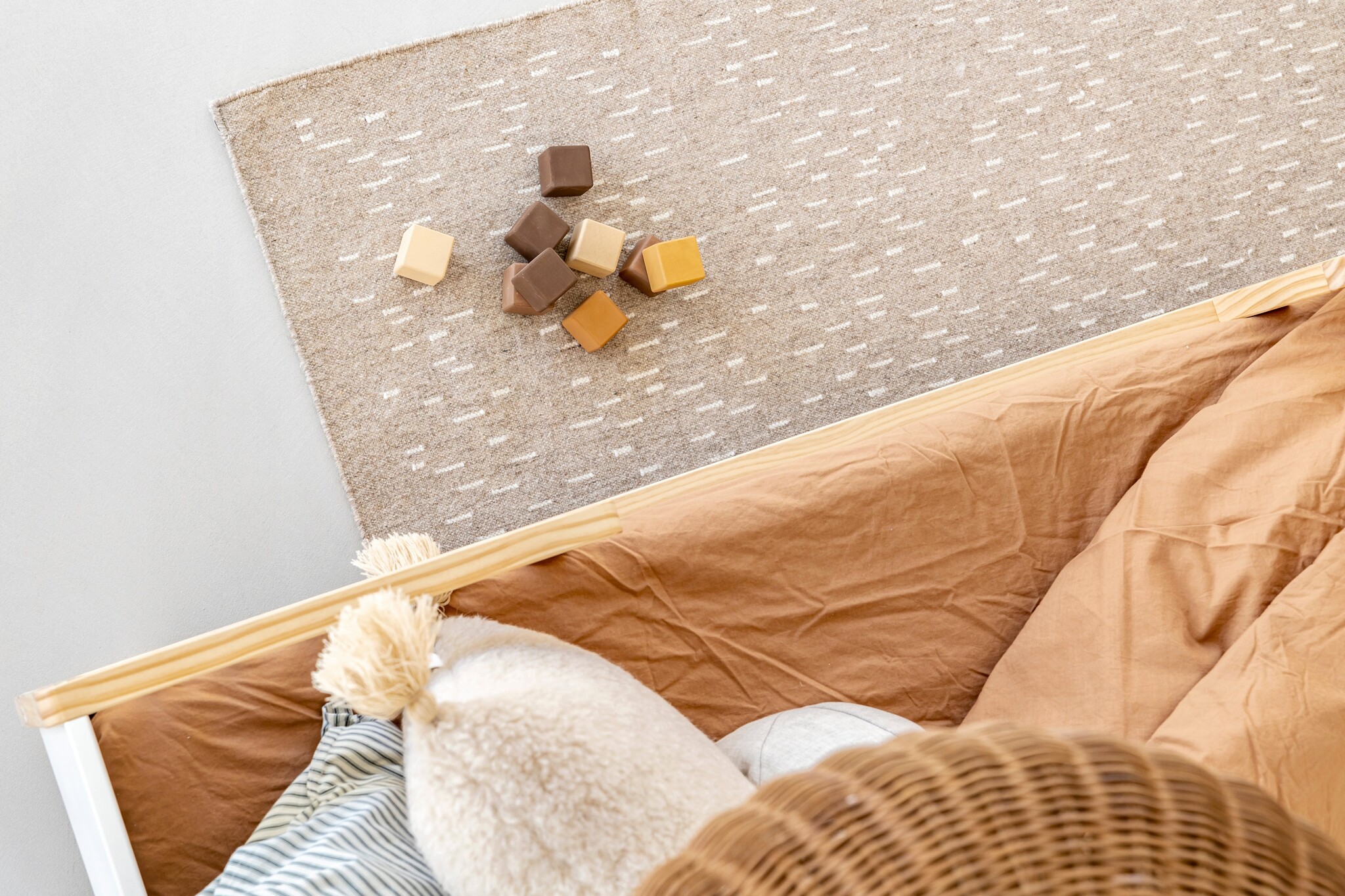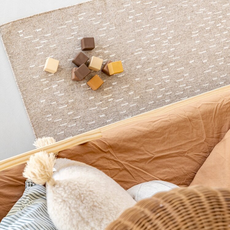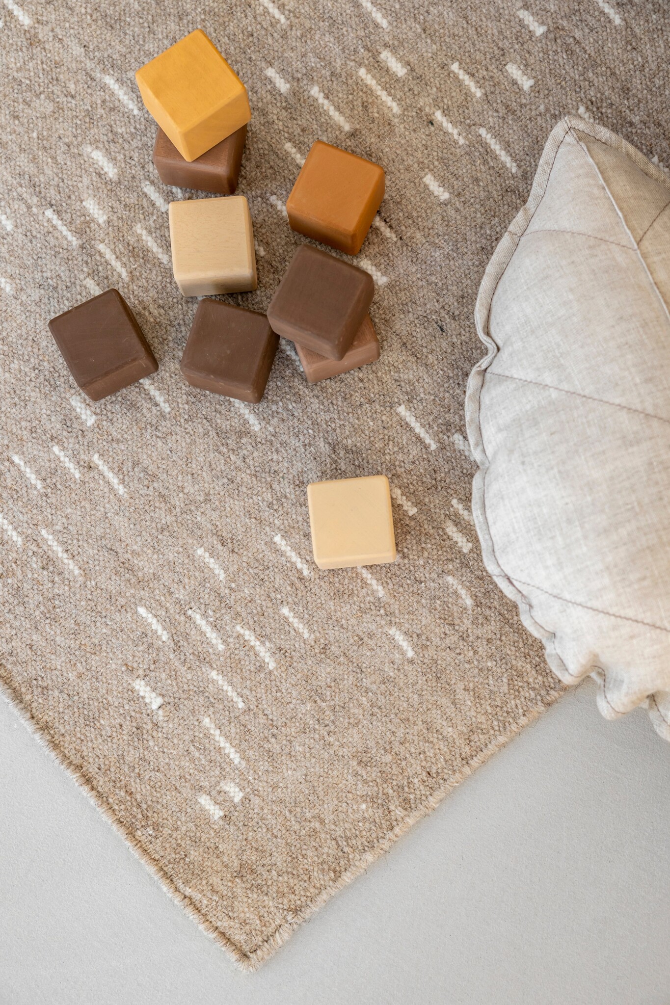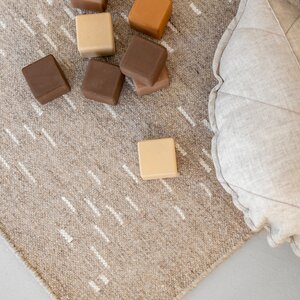 Het vloerkleed Bobby is één van de rechthoekige vloerkleden uit onze Ted & Tone capsulecollectie. De lieve, minimalistische ontwerpen van Ted & Tone passen heel mooi bij de sfeer van Tapis Petit. Voor deze nieuwe collectie hebben we een wollen vloerkleed ontwikkeld in natuurlijke kleuren. Het vloerkleed heeft een bruine en beige kleur en is kilim geweven. Als je van een ‘natural’ look houdt, is dit wollen vloerkleed een echte must-have voor jouw kinderkamer.