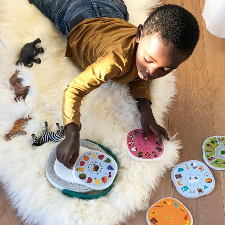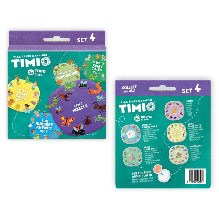 TIMIO biedt magnetische disks met een bibliotheek aan materiaal: van kinderliedjes en slaapliedjes tot sprookjes en woordenschat. Wil je wat meer afwisseling voor de 5 standaard meegeleverde schijven? Bekijk dan zeker eens de 4 uitbreidingssets van TIMIO. Zo hebben je kinderen nog meer speelmogelijkheden!