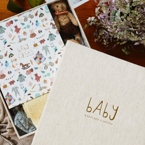 Maak een Baby Keepsake Capsule met in de tijd vastgelegde details om door te geven als een intieme, nostalgische herinnering aan het eerste jaar van je baby. Leg alle eerste dingen van je baby vast in pagina's met foto's en handgeschreven verhalen. Documenteer gewicht en lengte, bewaar stukken in herinneringsenveloppen en print kleine hand- en voetafdrukken. Voeg dierbare bezittingen zoals een knuffel, rammelaar, muts of kleine outfit toe om de capsule compleet te maken.