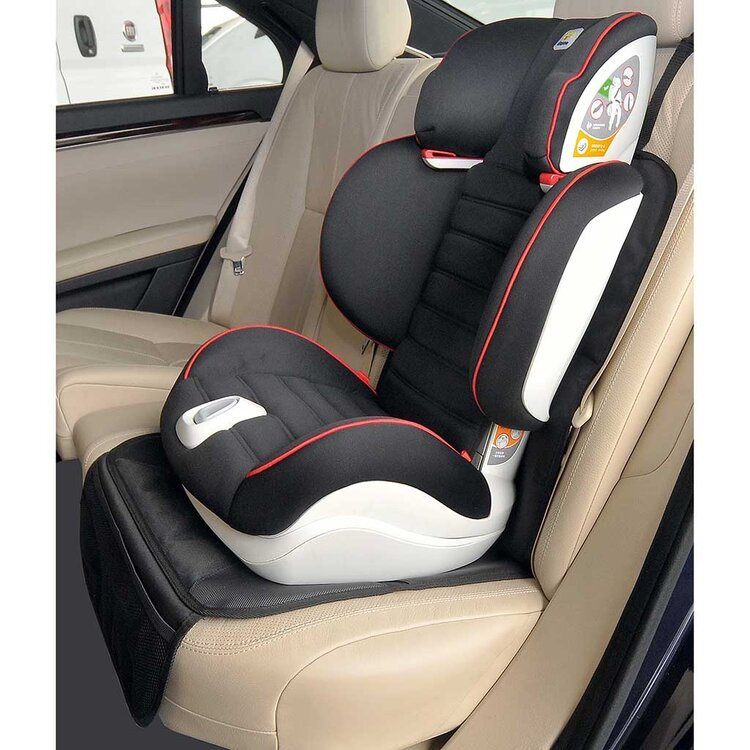 Handige autostoelbeschermer welke u onder het autostoeltje plaatst en wat beschadigingen en viezigheid aan de bekleding van de achterbank voorkomt. Voorzien van anti slip en 2 opbergvakjes aan de voorzijde waar b.v. een drinkbeker of speelgoed in kan.
